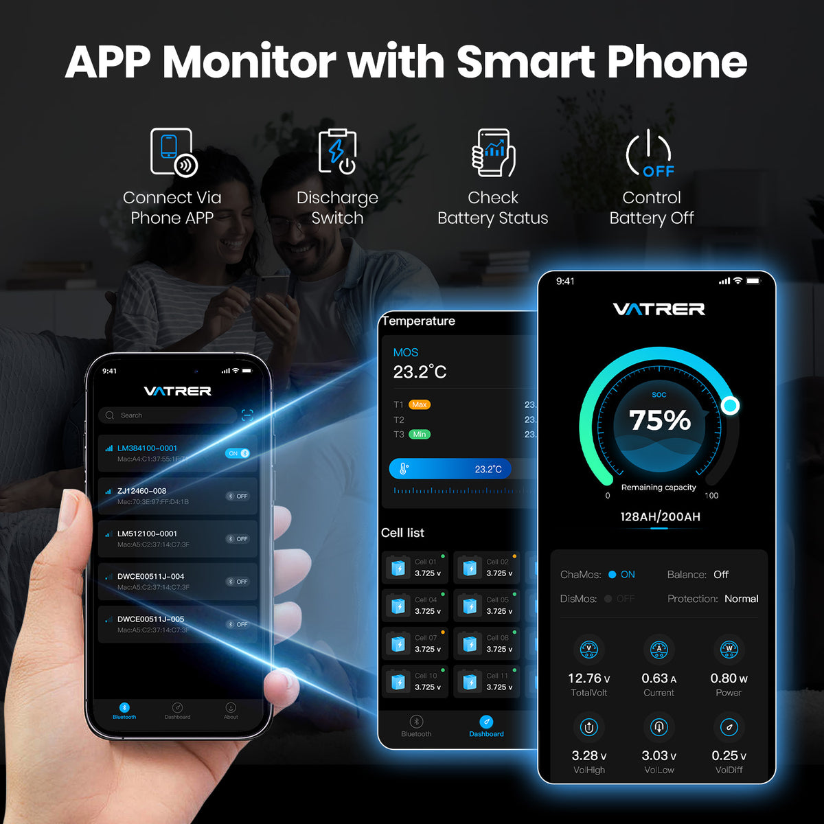 The Vatrer Bluetooth Lithium Battery is equipped with a built-in 200A Battery Management System (BMS) that ensures the battery's safety and longevity. The BMS protects against overcharging, over-discharging, and short-circuiting, providing comprehensive protection. Additionally, the low temp cut-off feature safeguards the battery during discharge in low-temperature conditions, preserving its integrity and performance.