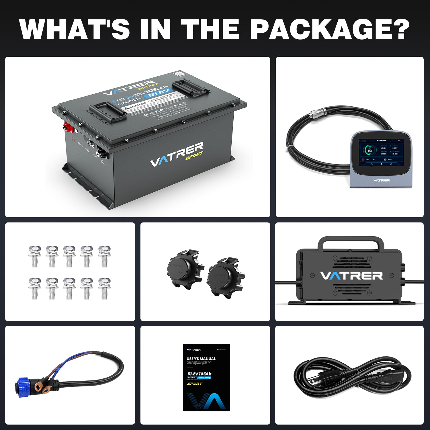 The Vatrer 48V 105Ah lithium battery is engineered to power a wide range of 48-volt vehicles, including UTVs, ATVs, golf carts, and street-legal utility carts. Whether you’re exploring rugged trails, handling farm or forestry tasks, or using it for resort and campus transport, this off-road battery provides reliable, high-power performance across all terrains. Each kit includes the 48V 105Ah LiFePO4 battery, a dedicated 58.4V 20A charger, a 10–90V LCD with mounting bracket, and all essential installation accessories. That means every component you need for setup is already included, making your upgrade seamless, efficient, and ready for adventure from the moment it arrives.