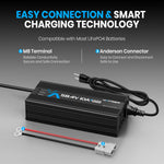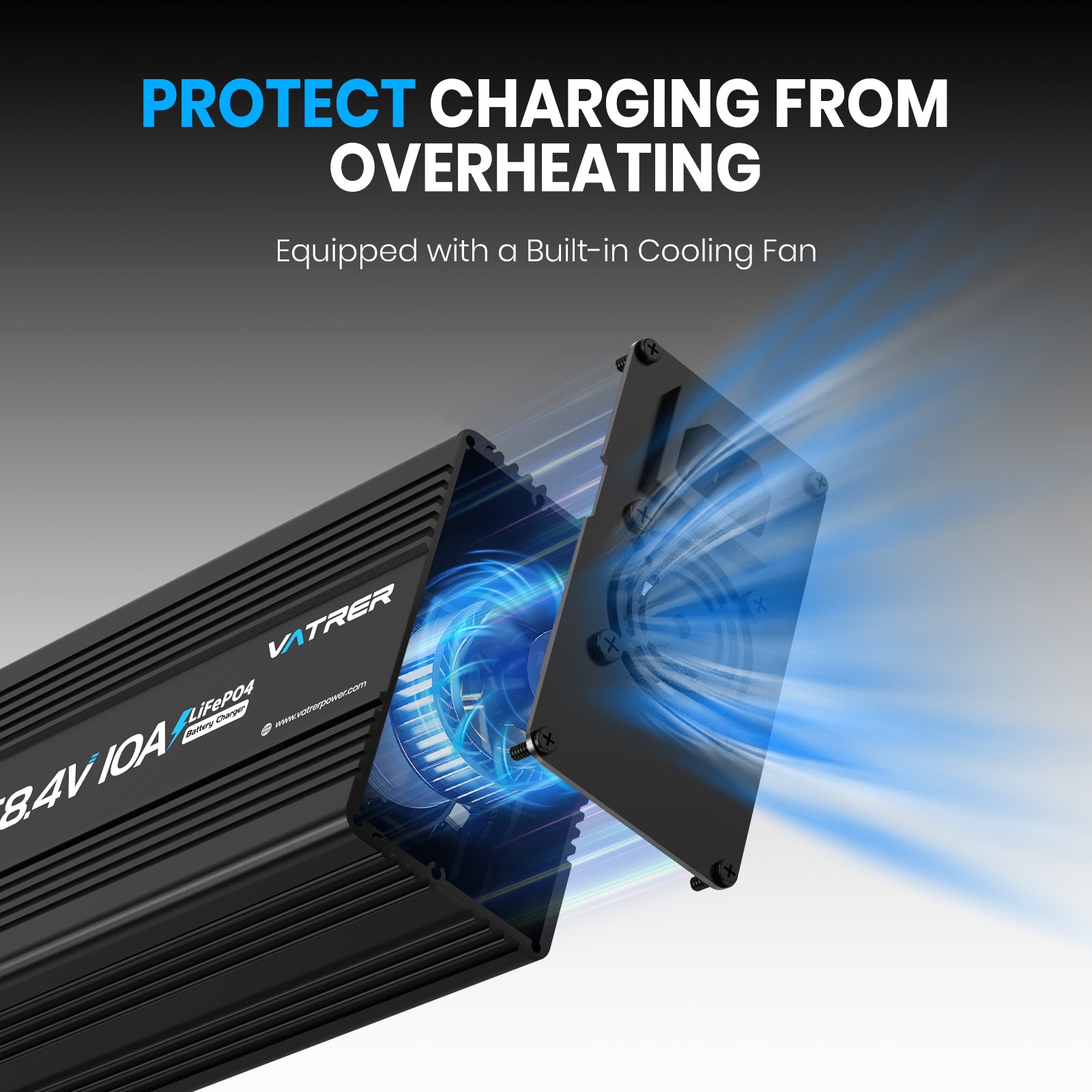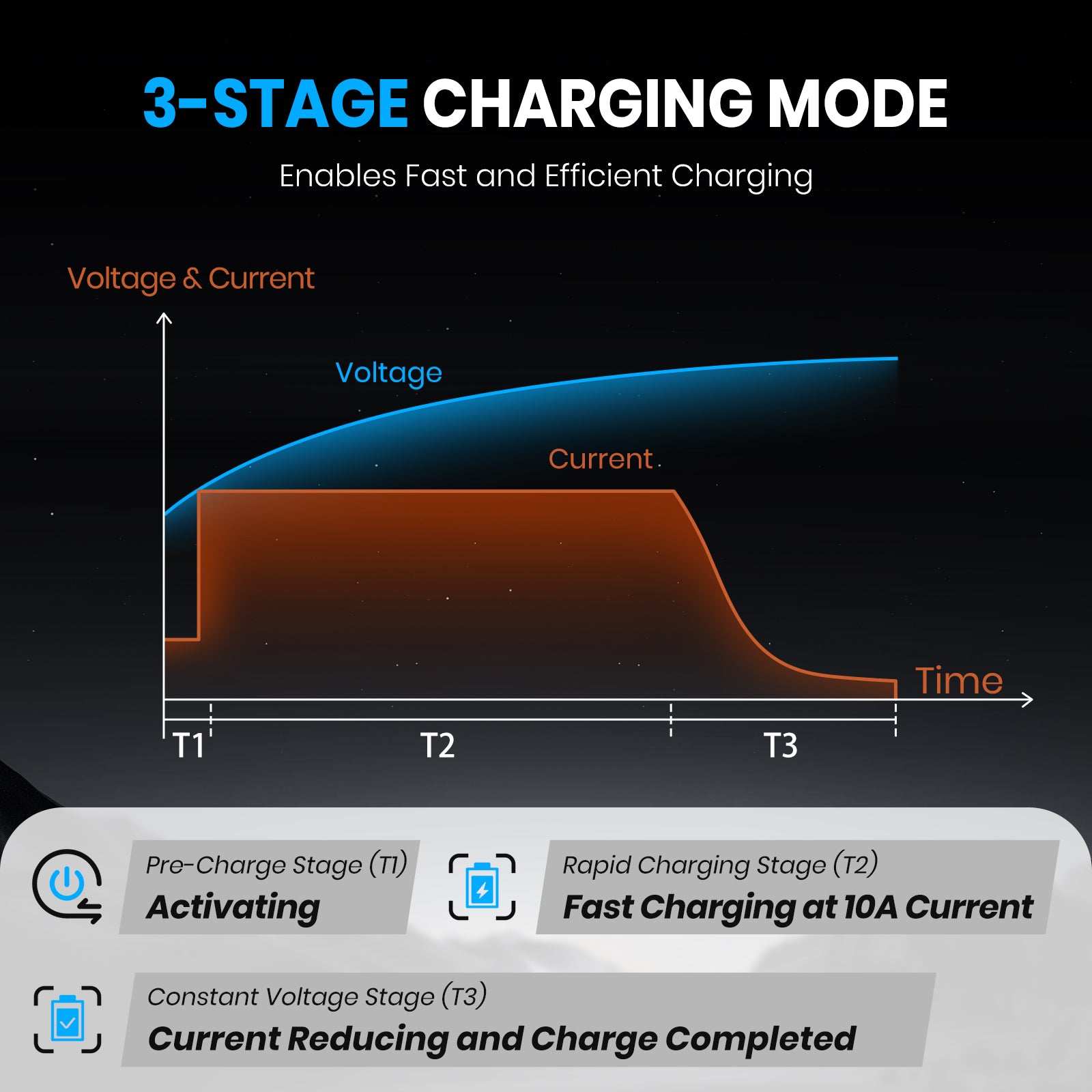 The Vatrer 48V lithium battery charger utilizes a single chip microcomputer (MCU) controlled 3-stage intelligent charging technology, which ensures the battery is always in the best electrochemical reaction condition, thereby prolonging its service life4.