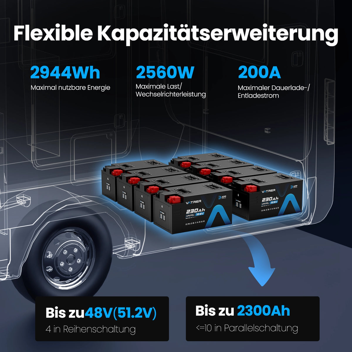 【Max. 51.2V 920Ah Expandable Capacity & Warranty solution】 Vatrer Power Lithium Iron Phosphate battery 12V 230Ah LiFePO4 batteries could be expanded to max. 4P4S as a 51.2V 920Ah battery system to get 40.96kW output power and 47.1kWh usable energy.Vatrer Power provides warranty solution for all batteries. 24hrs friendly and professional customer support, any question please feel free to contact us.