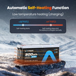 Unit price per【Automatic Self-Heating】12V 300Ah LiFePO4 battery model is equipped with an automatic self-heating function that will be activated by the BMS when the battery is connected to a charger at -4°F to 4°F. The heating will be stopped when the battery temperature reaches 41°F and then the battery will be formally charged. This feature makes it no problem to charge the battery at low temperatures. The battery's working environment is no longer restricted, but more flexible and convenient to use.