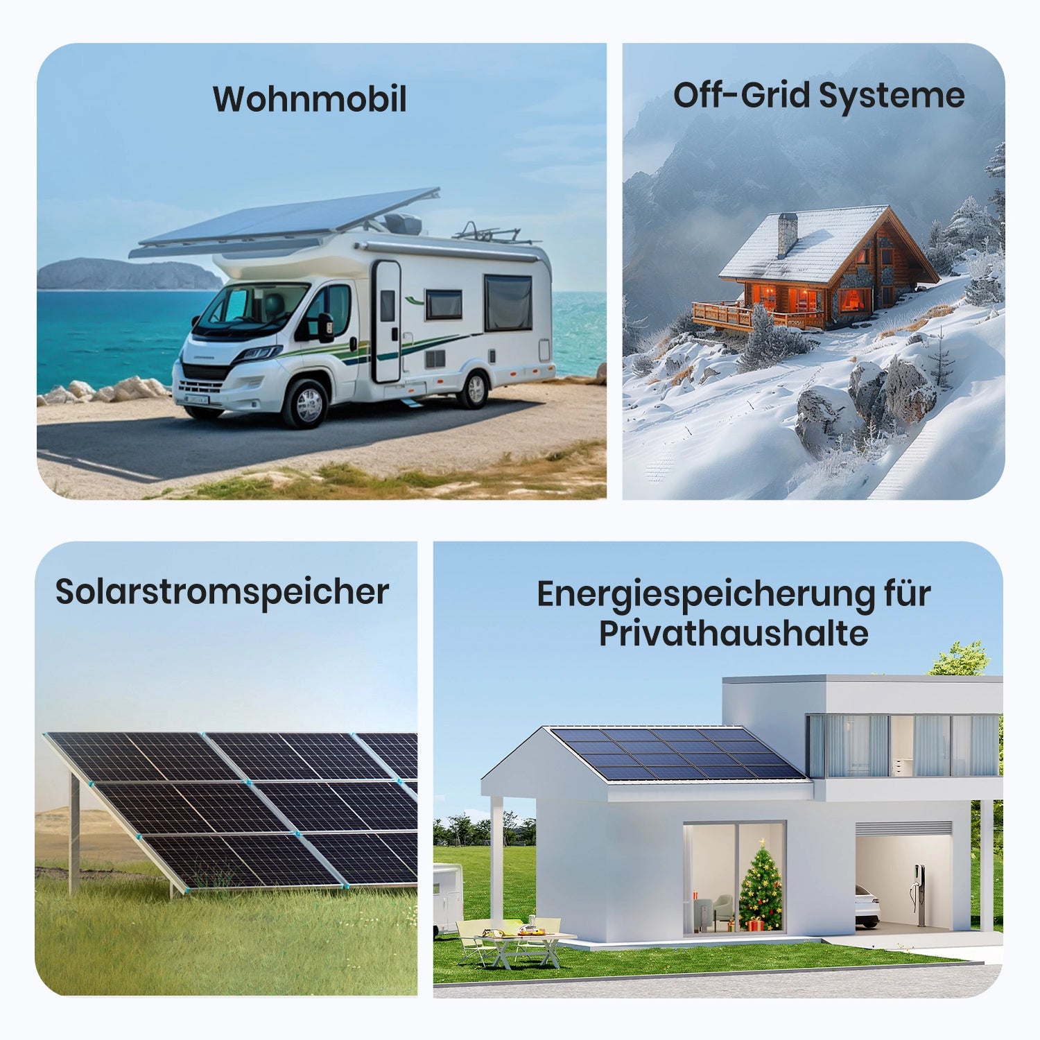 Flexible Parallel/Series Connection】The 12V 100Ah LiFePO4 battery can support up to 4 series and 4 parallel connections, with a maximum output energy and power of 20.48kWh and 20.48kW, making it an ideal and reliable energy storage solution for on-the-go applications. Perfect for motorhomes, caravans, energy storage at home, emergency power supply, and off-grid applications!