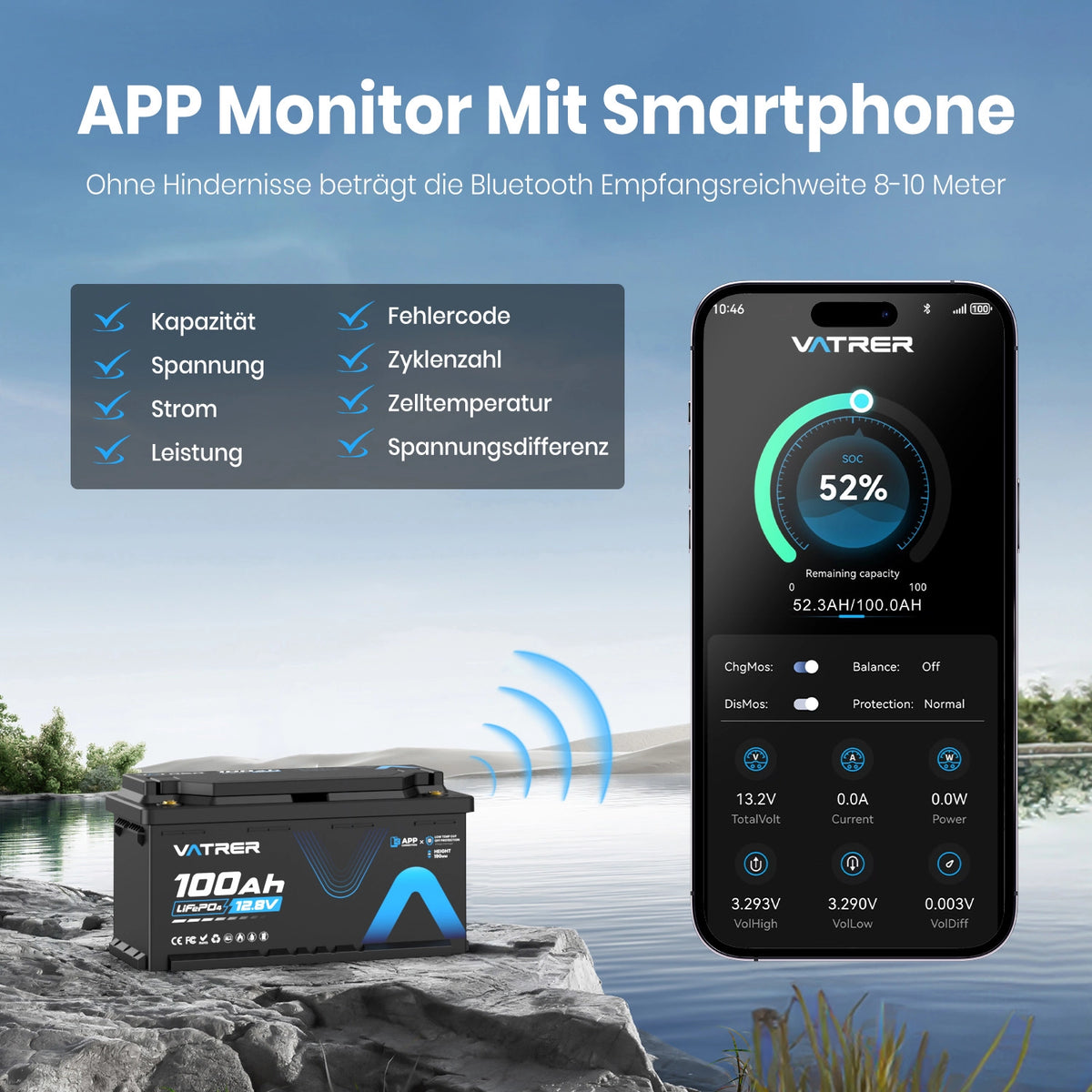 Smart Bluetooth 5.0 】With the VATRER app, you can monitor battery information (SOC, voltage, current, capacity, power, battery temperature, pressure difference, cycle count, etc.) in real-time and check the charge/discharge/protection status of your LiFePO4 battery anytime and anywhere! In case of battery overcharging, the app displays the corresponding error status, allowing you to make timely adjustments.