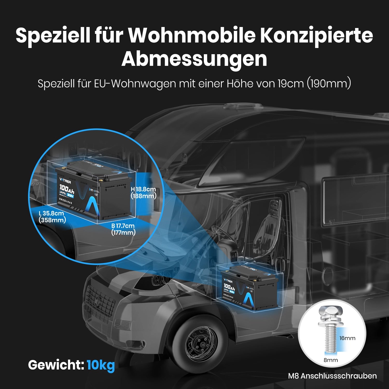 Vatrer 12V 100Ah H190 Bluetooth LiFePO4 Battery with 188mm Height 1280Wh 5000+ Cycles Lithium Battery EU