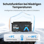 Low-Temperature Protection & 100A BMS】Low-temperature protection prevents battery damage in low-temperature environments. The battery can discharge at temperatures ranging from -20°C to 60°C. The smart 100A BMS protects the LiFePO4 battery from overcharging, over-discharging, overheating, overcurrent, and short circuits.
