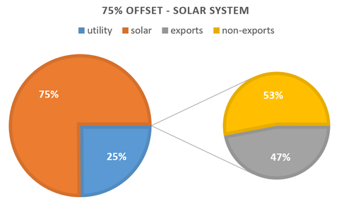 この図は、さまざまなサイズのシステムにどれだけの太陽光発電が輸出されるかを示すことを目的としています。 75% オフセット システムでは、年間太陽光発電量の約半分が送電網に輸出されることは驚くべきかもしれません。これは、0 ドルと仮定すると、年間 170 ドル (月額 14 ドル) のヘアカットに相当します。 NBC を合計すると 04/kWh。