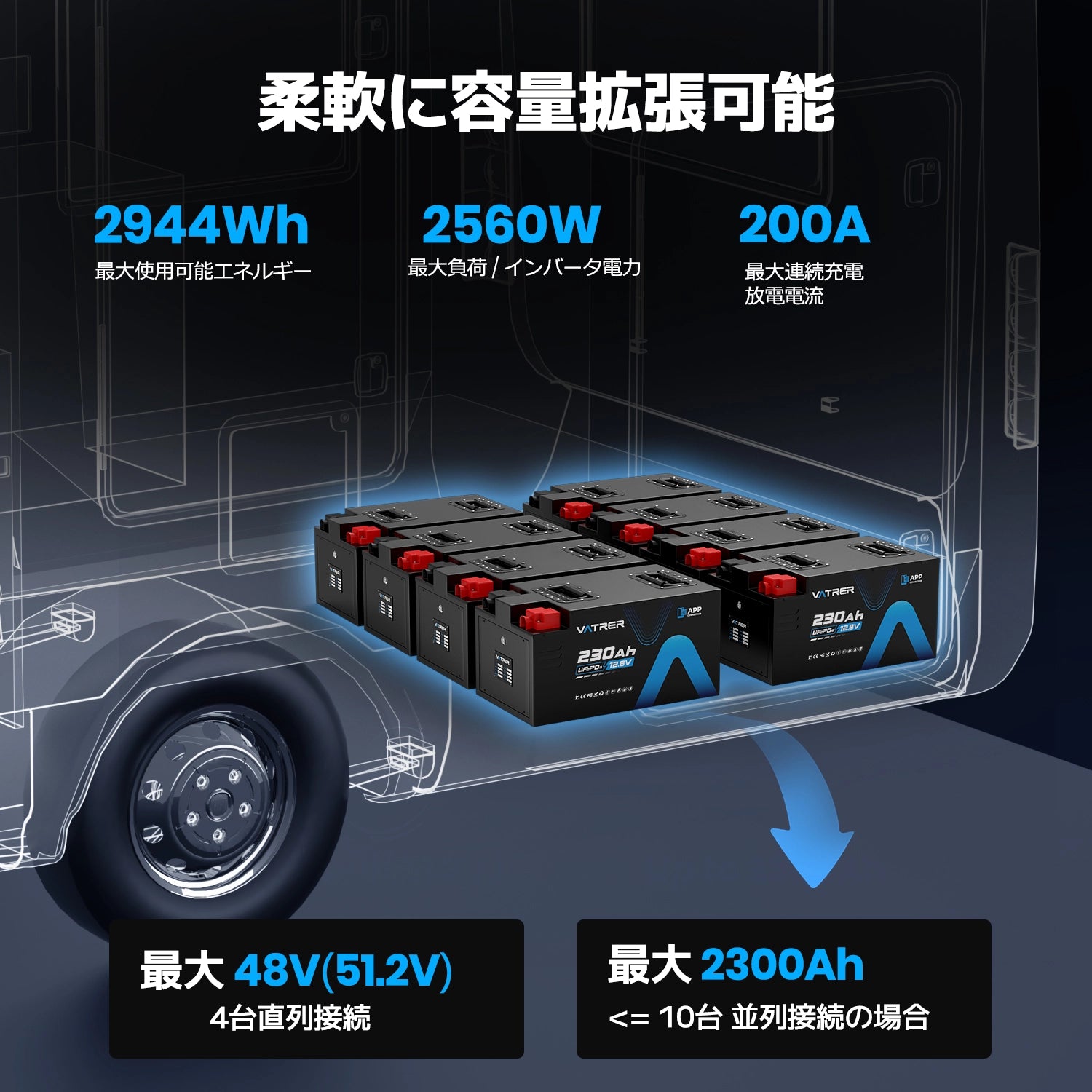 【最大 51.2V 920Ah 拡張可能容量と保証ソリューション】 Vatrer Power リン酸鉄リチウム電池 12V 230Ah LiFePO4 電池は、51.2V 920Ah 電池システムとして最大 4P4S まで拡張でき、40.96kW の出力電力と 47.1kWh の使用可能エネルギーが得られます。Vatrer Power はすべての電池に保証ソリューションを提供します。24 時間フレンドリーでプロフェッショナルなカスタマー サポート。ご質問がございましたら、お気軽にお問い合わせください。
