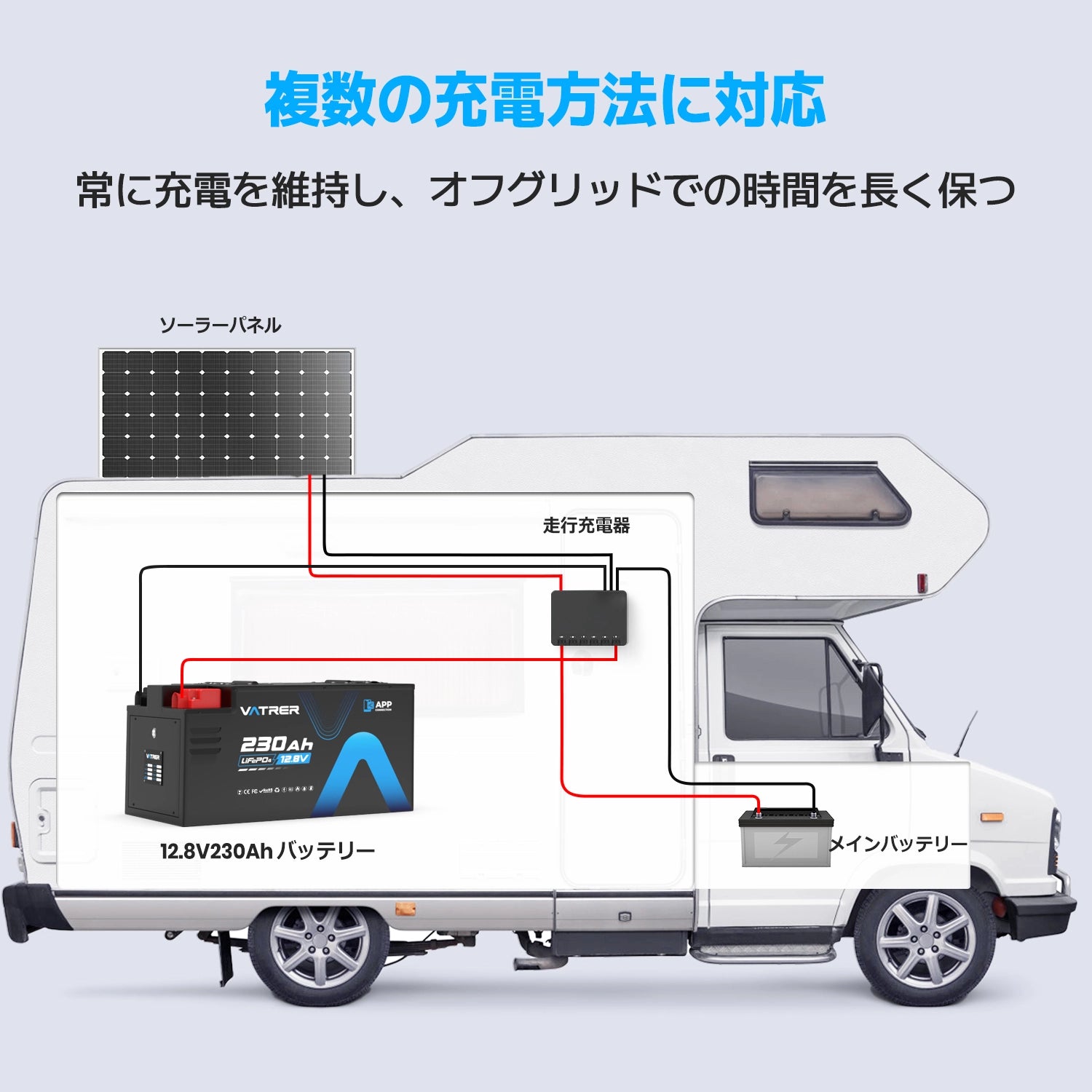 Vatrer 12V 230Ah 低温カットオフ LiFePO4 RV バッテリーを使用して、いつでもどこでも RV アドベンチャーの準備をしましょう。この優れたバッテリーは、RV に信頼性の高い電力を供給するだけでなく、3 つの多用途な充電方法も提供し、常に次の旅行に備えることができます。 Vatrer Battery を RV ライフスタイルに最適なパートナーにする、便利な充電オプションを見てみましょう。