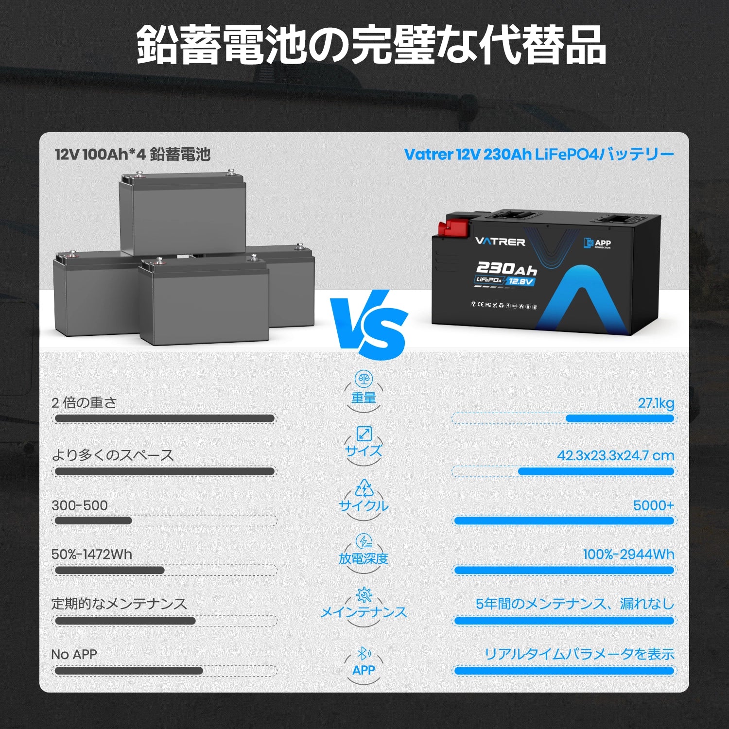 【コンパクトなサイズで最大の電力】Vatrer 12V 230Ah LiFePO4 RV バッテリーは、3 x 100Ah バッテリーのエネルギーに相当しますが、占有スペースはわずか0.6ft³で、3x100ah バッテリーよりも小さくなります。また、余分な配線やお金を必要とせず、メンテナンスや設置が簡単になります。お金とスペースを節約するのに役立ちます。