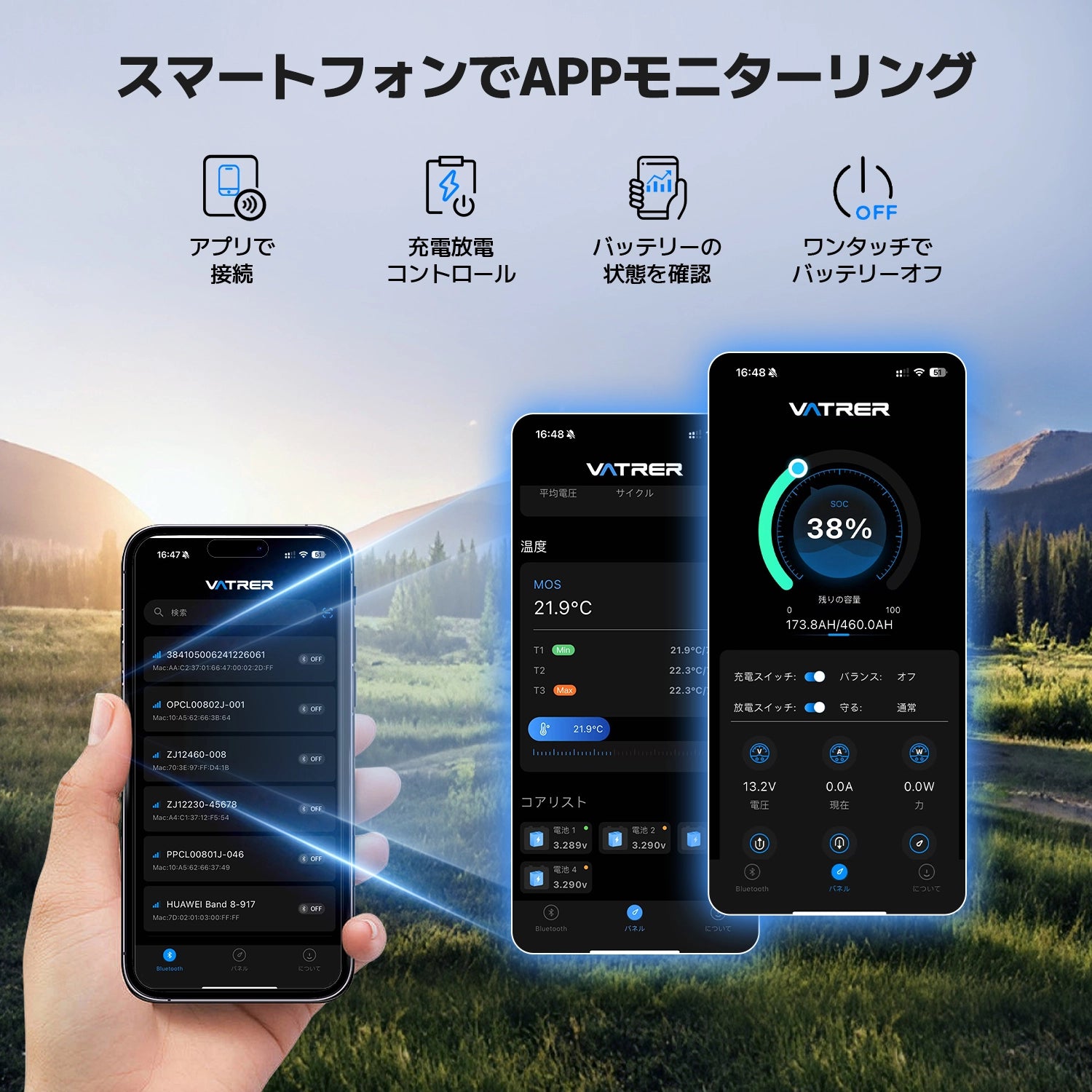 ● 3つの充電方法に対応:LiFePO4対応充電器、ソーラー、発電機。