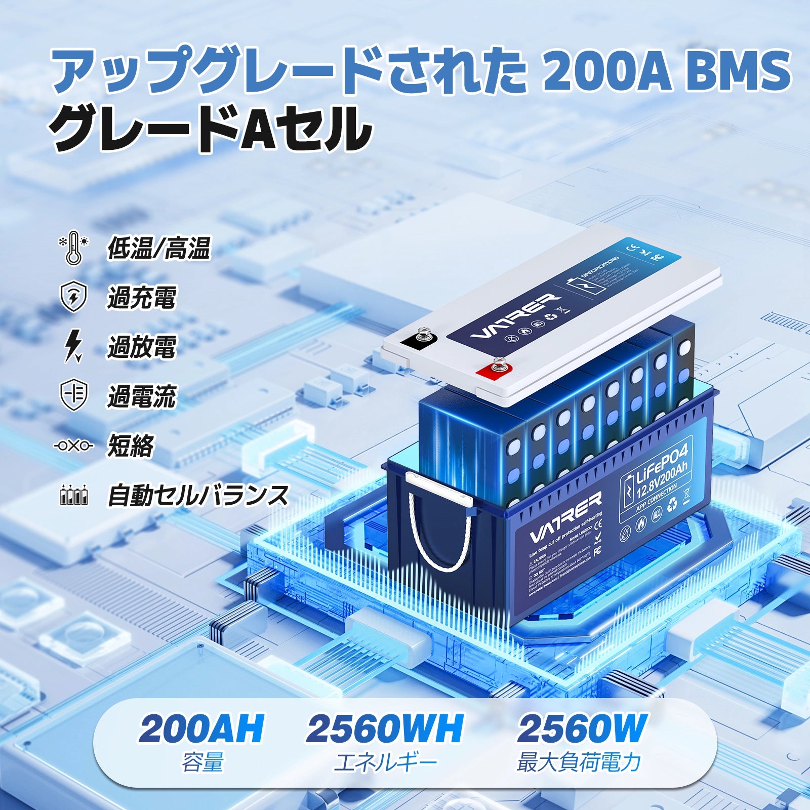 統合された200Aバッテリーマネジメントシステム(BMS)は、過充電、過放電、短絡などからバッテリーを保護し、長寿命化に貢献します。また、セル電圧のバランス調整や温度管理も行い、バッテリーのパフォーマンスを最大限に引き出します。