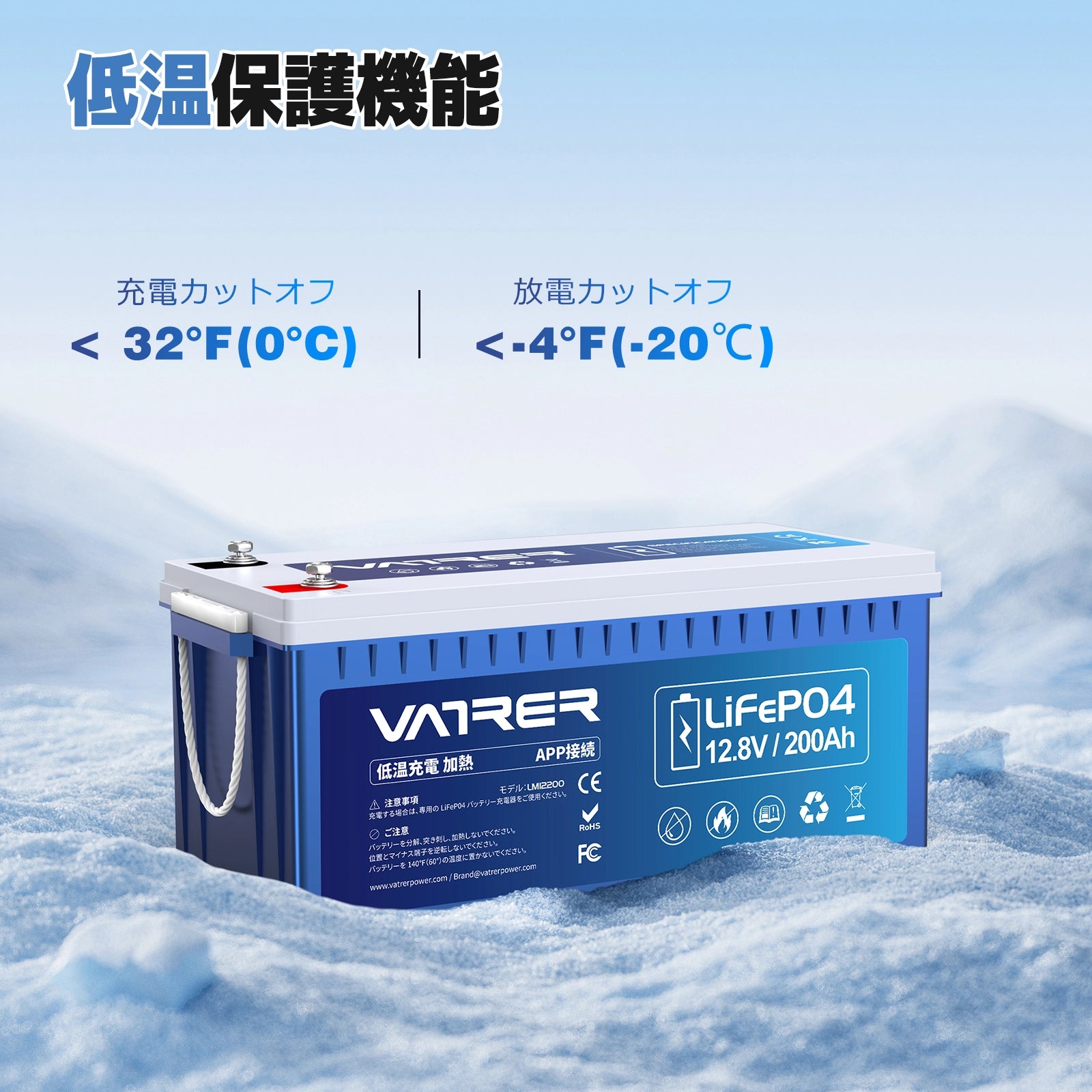 Vatrerリチウムバッテリーは、低温時の放電による損傷を防ぐ「低温遮断機能」を搭載しています。指定された温度を下回るとこの機能が作動し、バッテリーの保護と信頼性を確保します。過酷な環境下でも安心して使用いただけます。