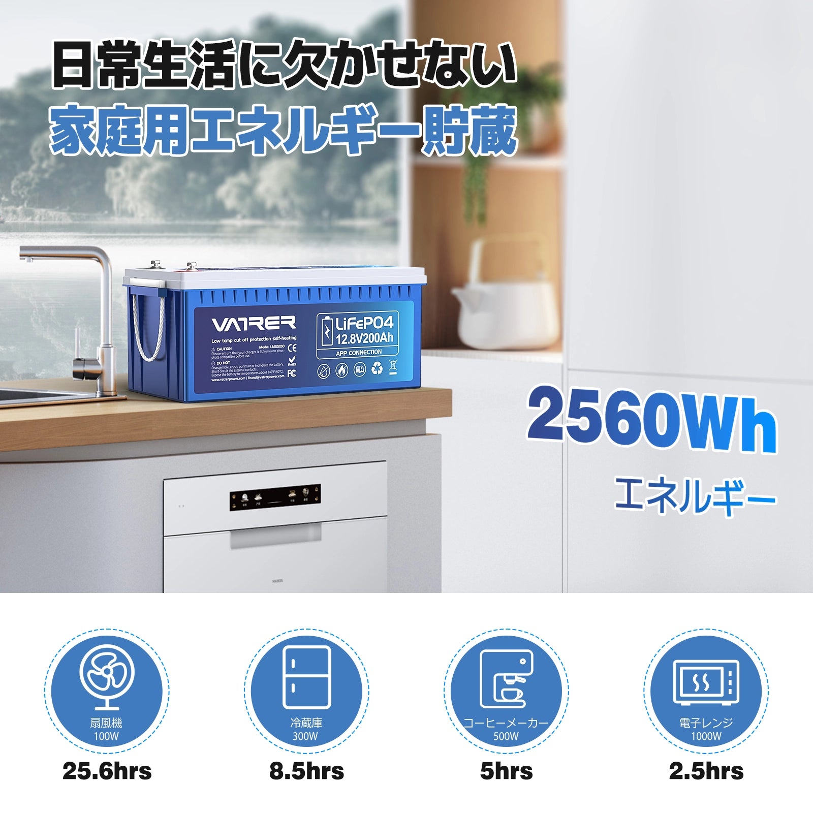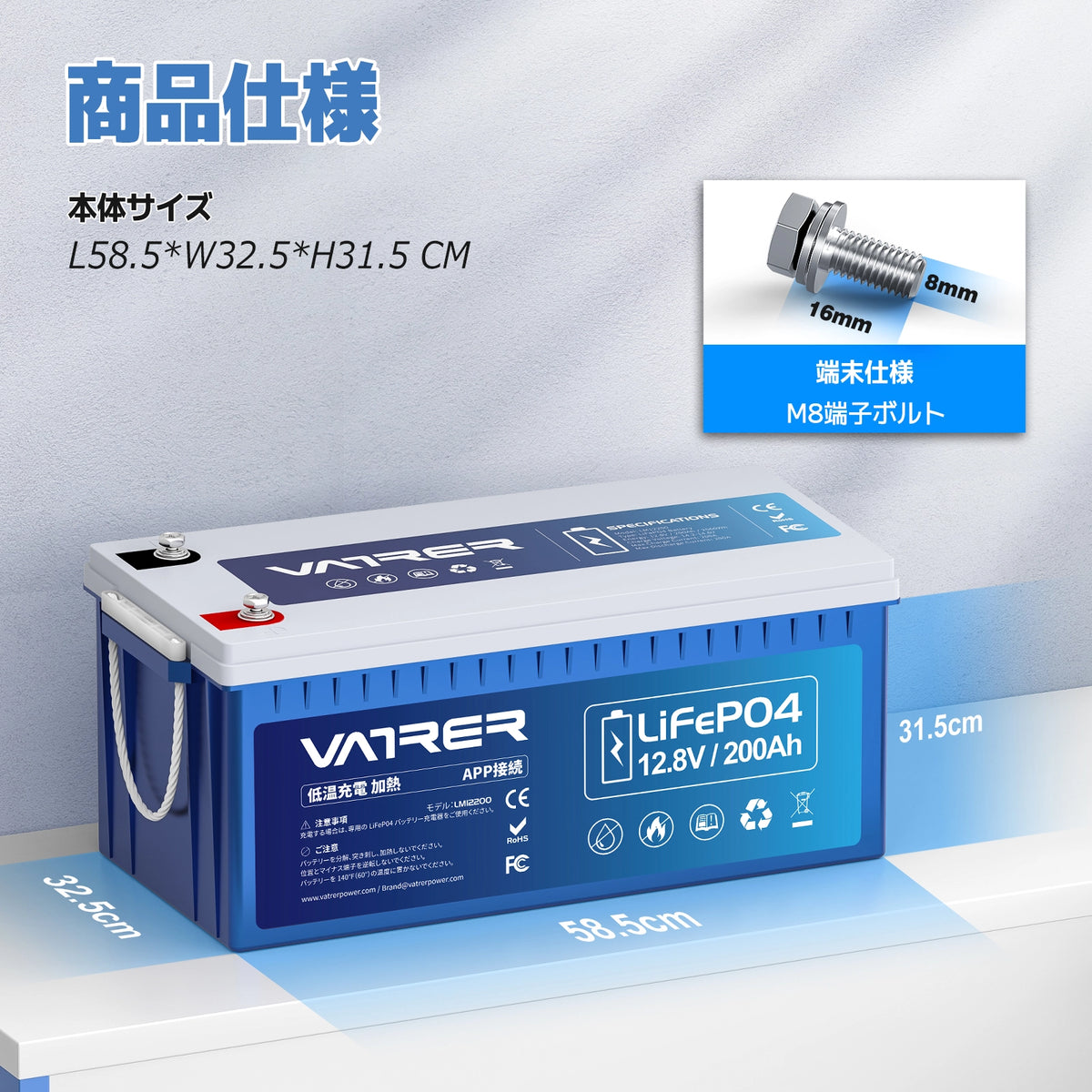 Vatrer 12V 200Ah 200A BMS Bluetooth LiFePO4 リチウム自己発熱バッテリー