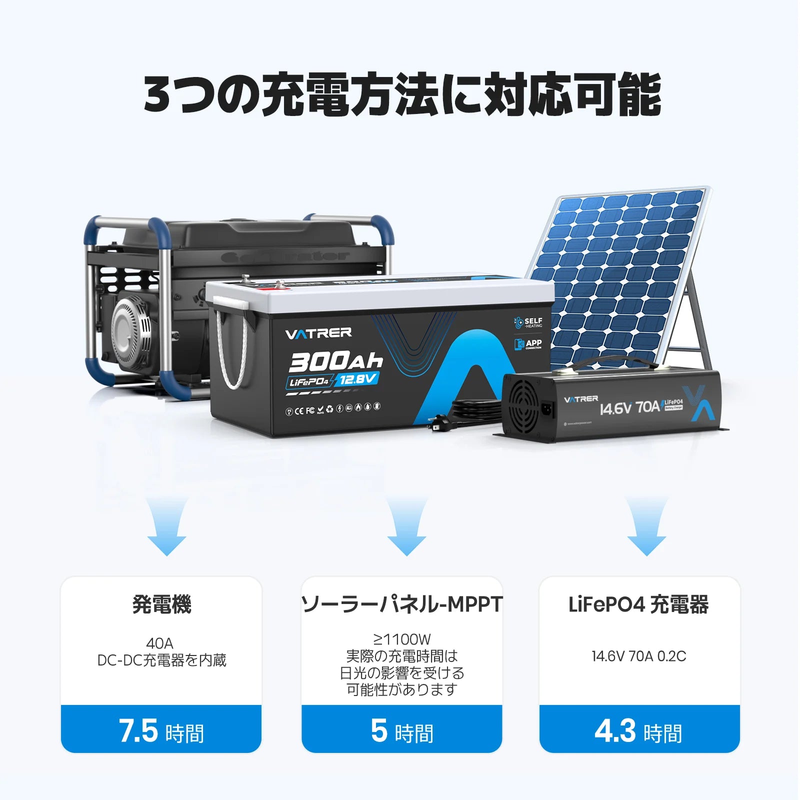 Vatrer Battery で太陽の力を利用しましょう。太陽光充電システムをサポートするように設計されたこの LiFePO4 バッテリーは、太陽光発電セットアップの効率を最大化します。 Vatrer バッテリーは自己発熱機能を備えているため、低温でも最適なパフォーマンスを保証し、太陽エネルギーへの投資を最大限に活用できます。