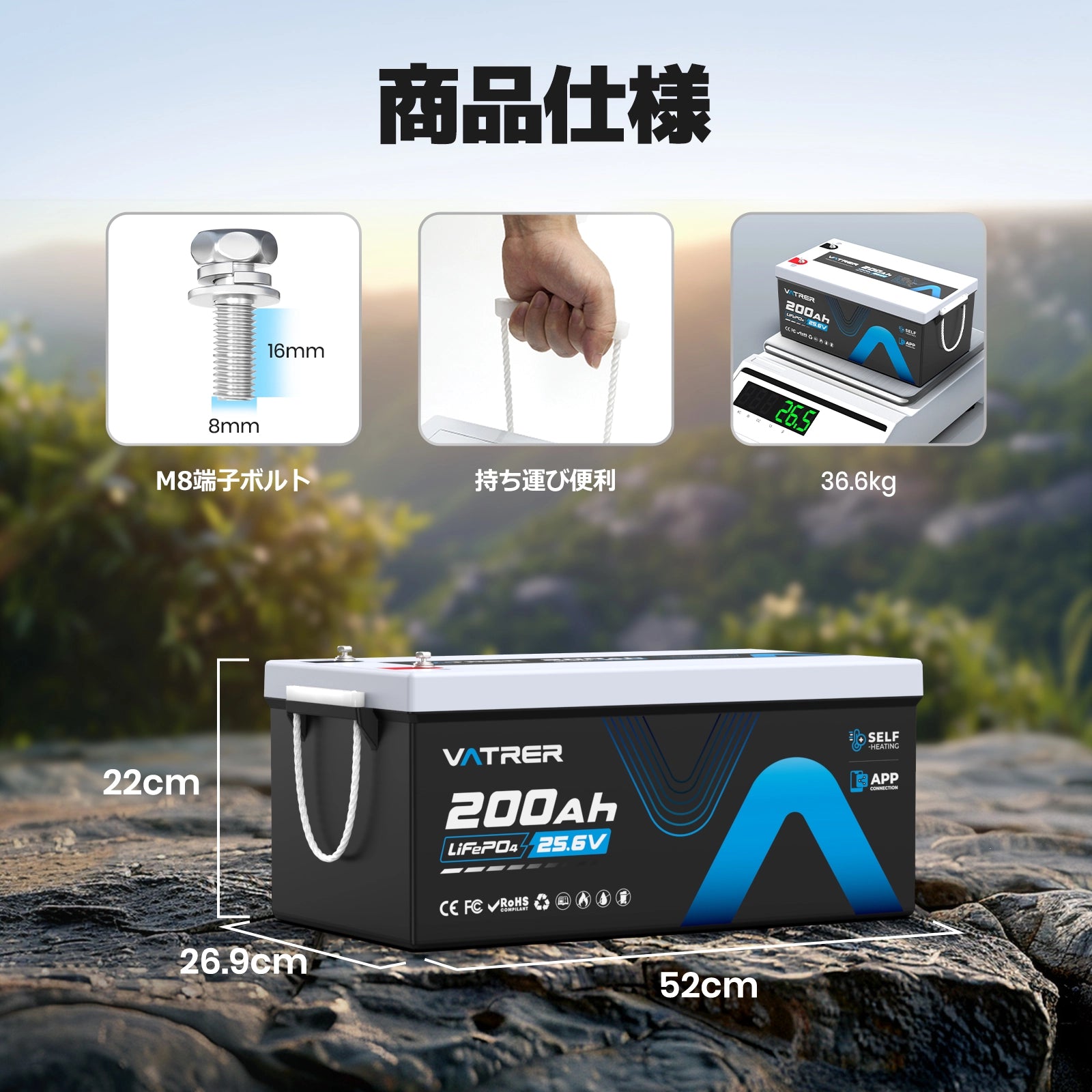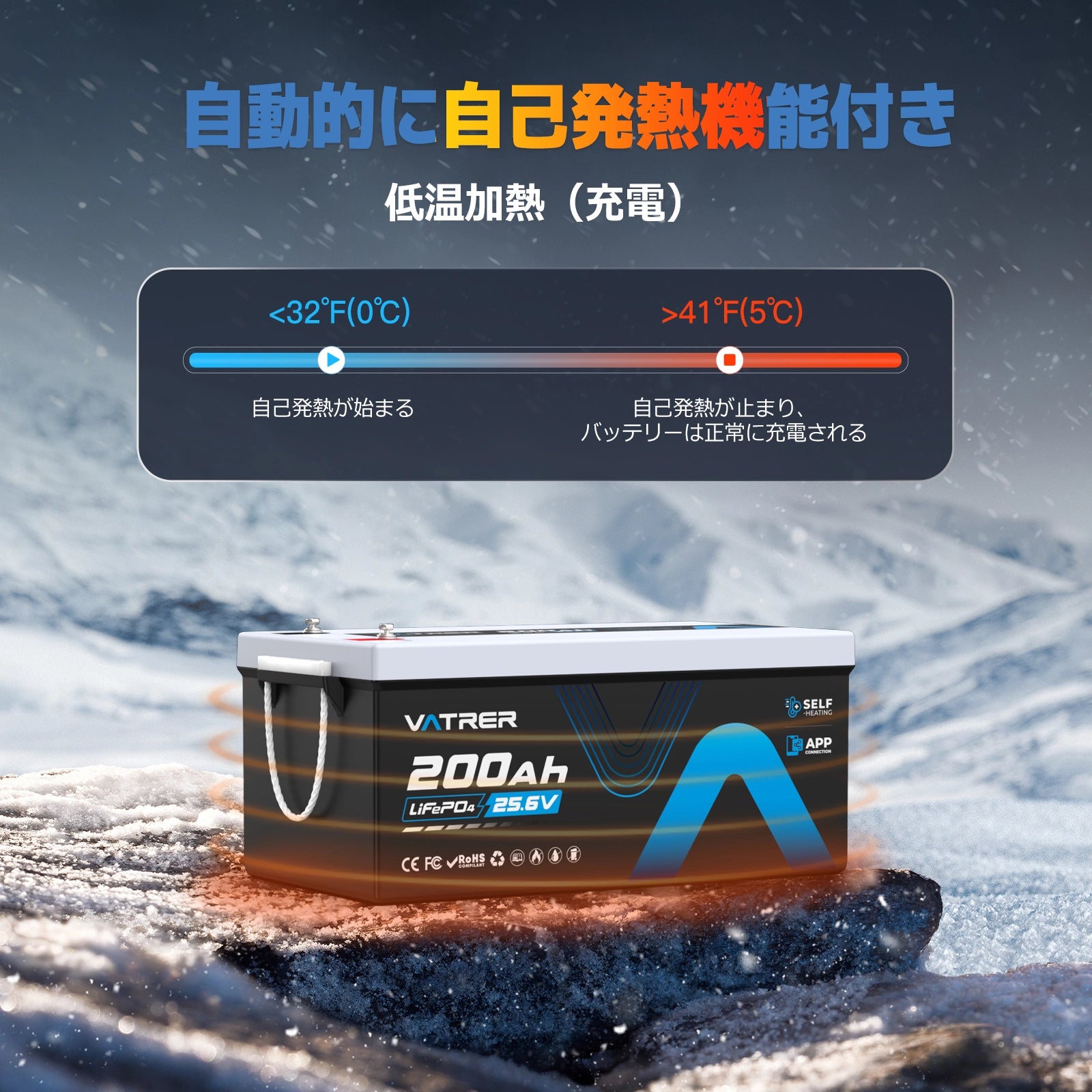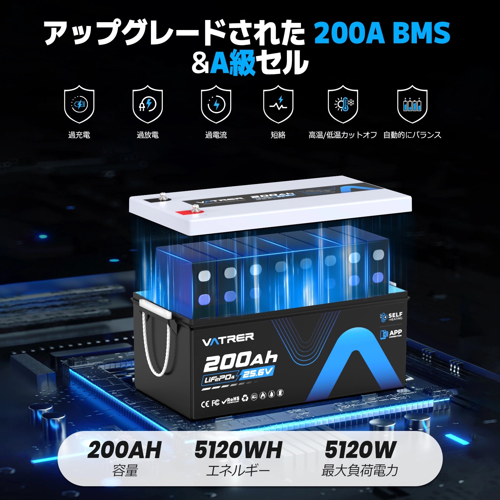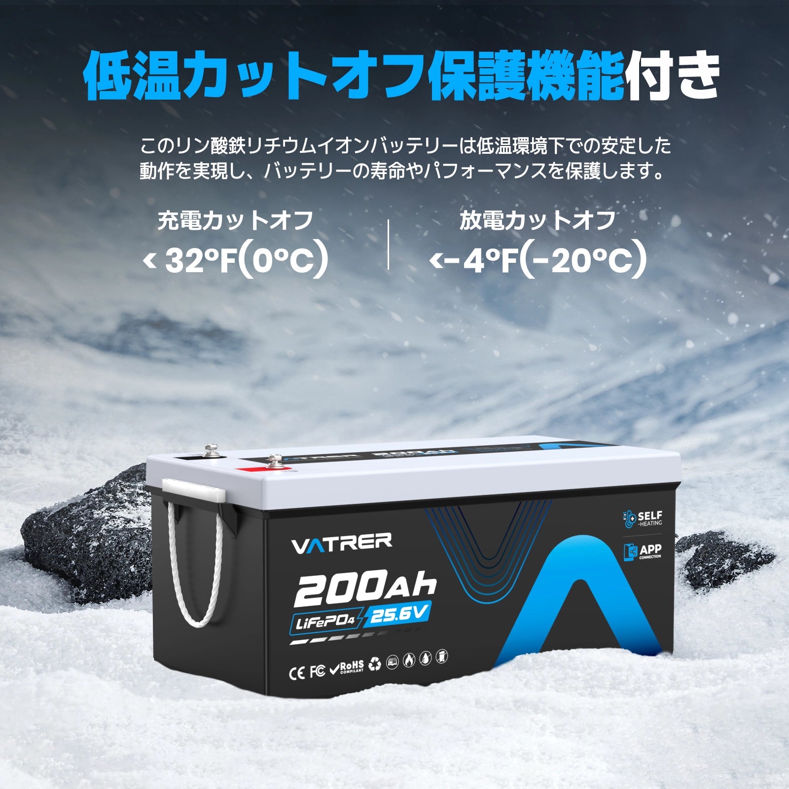 VATRER LiFePO4 24V200AH リン酸鉄リチウムイオンバッテリー 自己加熱 トローリングバッテリー APPコントロール 低温保護 リン酸鉄電池 BMS内蔵