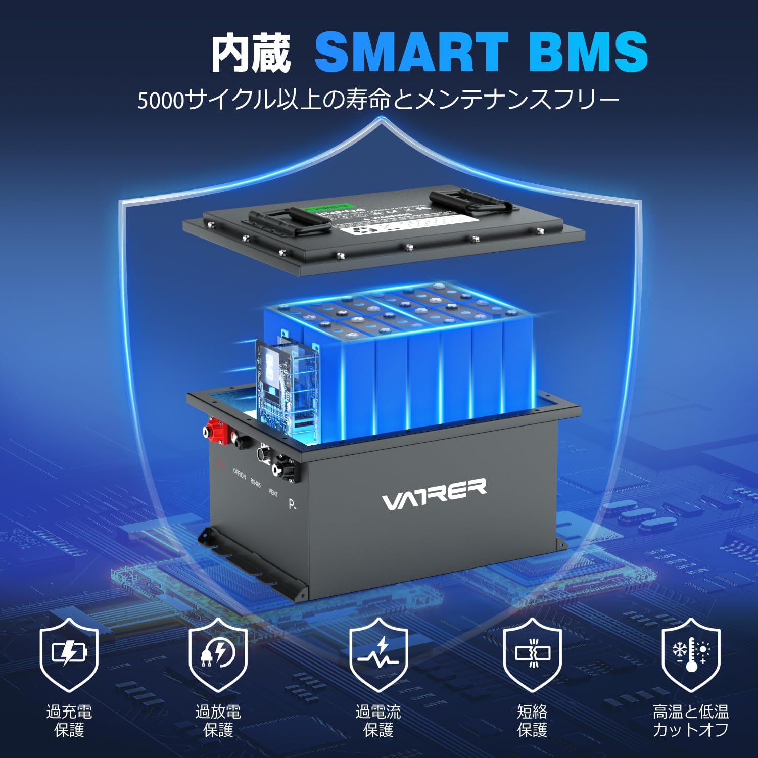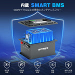 Vatrerの36Vリチウムイオンバッテリーは、過充電・過放電・高温・低温・過電流・短絡などに対応する高性能BMS(バッテリーマネジメントシステム)を内蔵し、安心・安全にご使用いただけます。200Aの連続放電、35秒間最大400Aのピーク放電に対応し、必要な瞬発力も備えています。