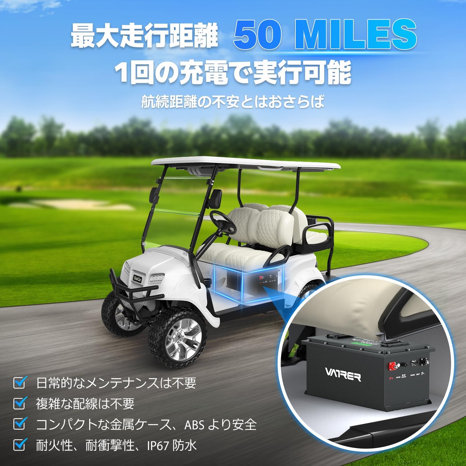 Vatrer製36Vゴルフカート用リチウムバッテリーなら、最長約80km(50マイル)走行可能。バッテリー残量を気にせず、存分にプレーを楽しめます。