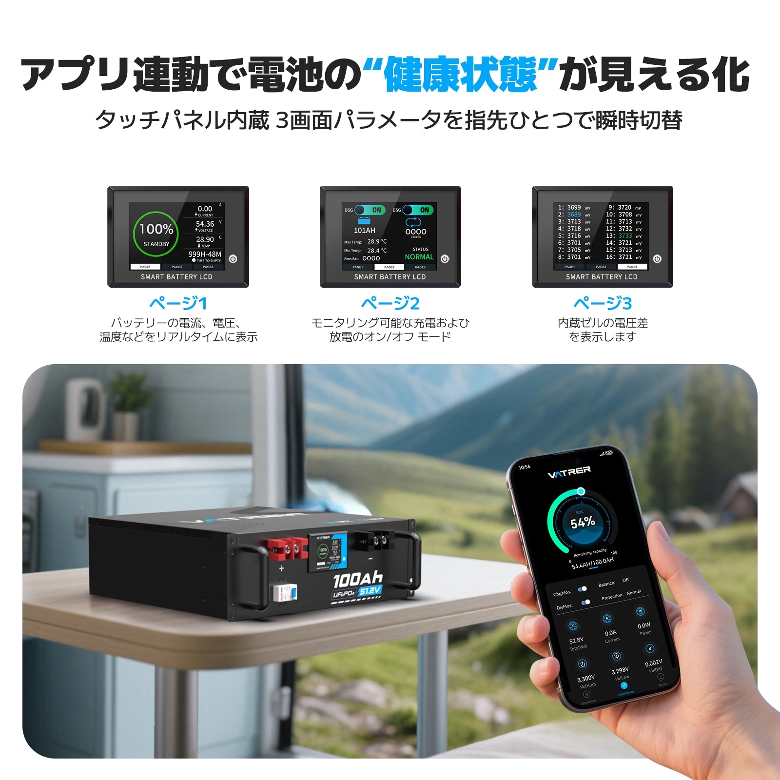 本ラックマウント型ソーラーバッテリーは、最大5,120Wの負荷電力とBluetooth接続機能を備え、スマートデバイスとの今後な統合を可能にします。革新的な液晶ディスプレイ画面と専用アプリモニターにより、3種類の画面ページにアクセスページ1ではバッテリーの電流・電圧・温度の一時表示、ページ2では充電モードと放電モードの制御ができます、ページ3では内部セル間の電圧差を監視できます。Vatrerの先進技術で、スマート電力管理と簡単なモニタリングを実現してください。