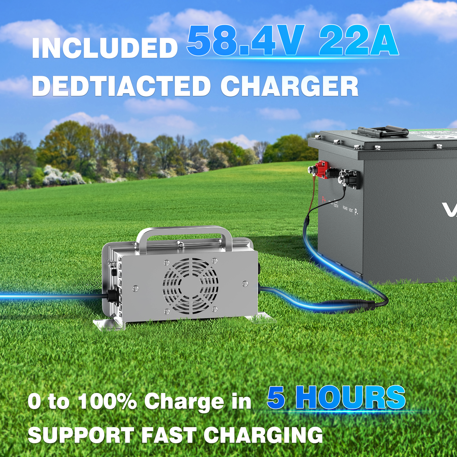 - 2.8インチのタッチスクリーンが付属しており、LCD画面でバッテリー情報をリアルタイムで確認できます。また、急速充電をサポートする58.44V 22A LiFePO4充電器が付属しています。