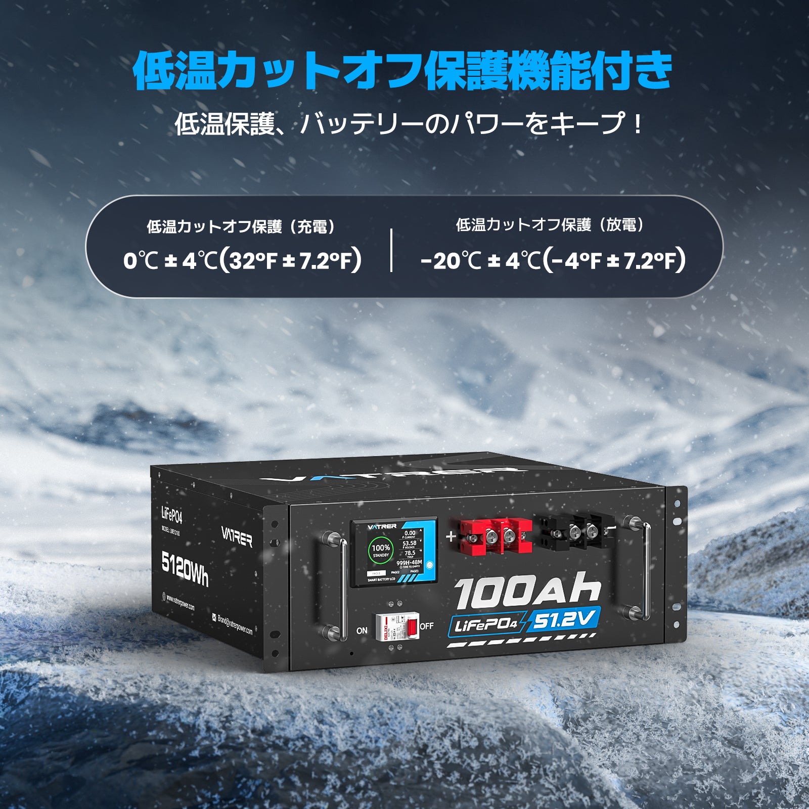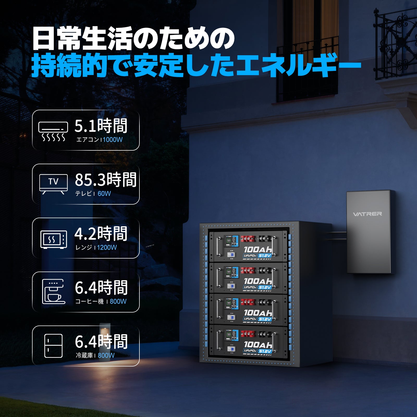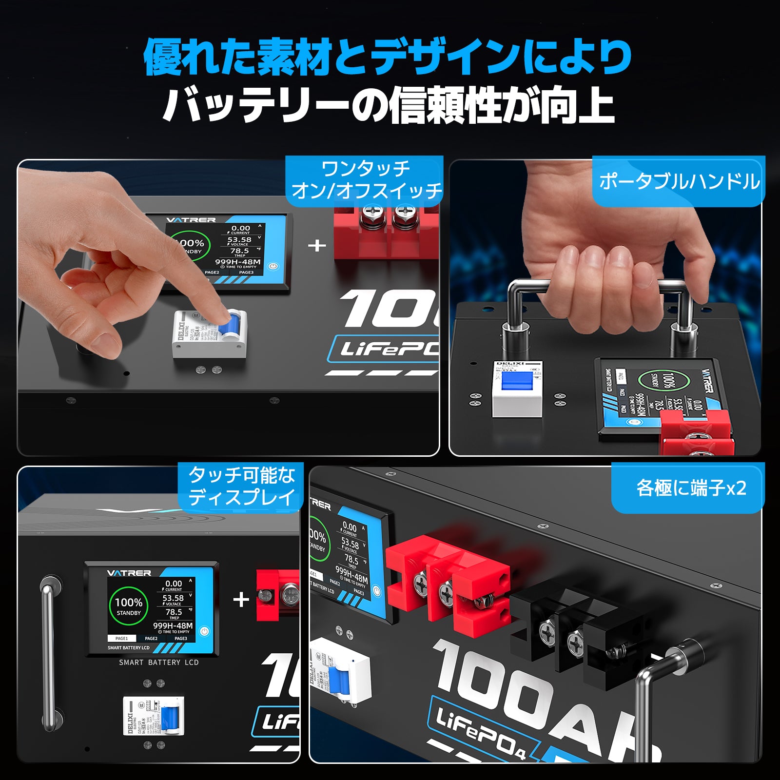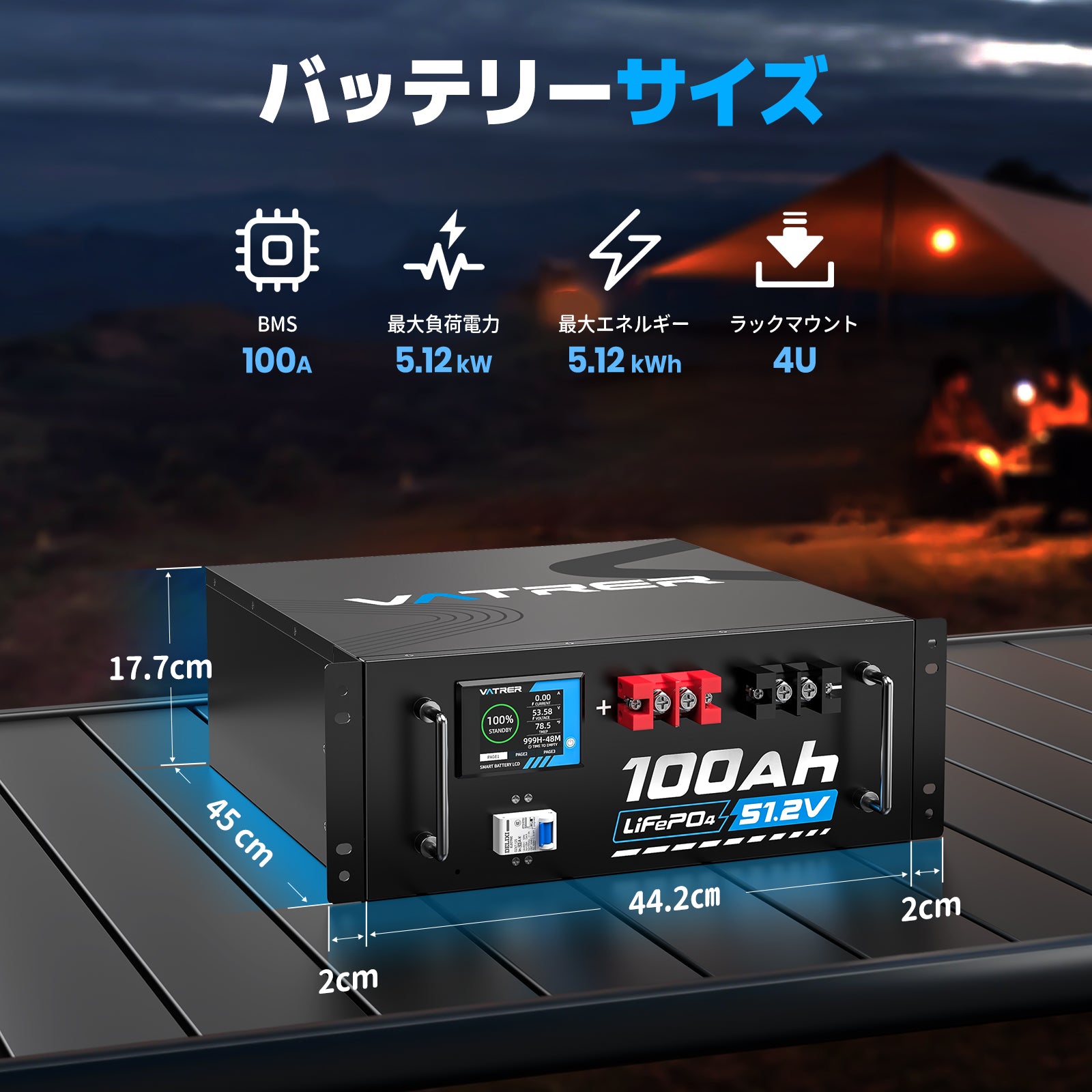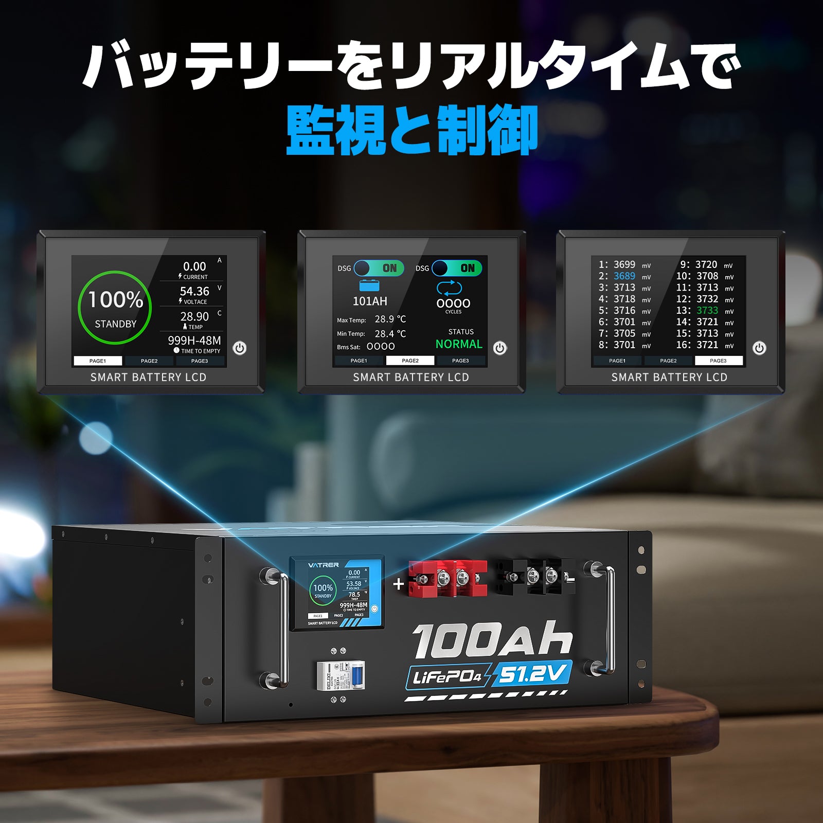 Vatrer 51.2V 100Ah LiFePO4 リチウム太陽電池、内蔵 100A BMS、最大。 5120W 負荷電力、Bluetooth バージョン