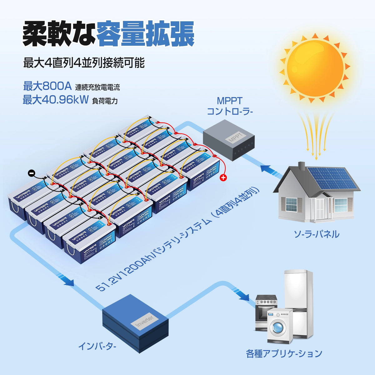 - 自動車グレードの LiFePO4 セルで製造されたリチウム バッテリーは、エネルギー密度が高く、メモリー効果がなく、より安定したパフォーマンスとより大きな出力を備えています。優れたサイクル性能、高速充放電、最大100%の充電効率、高出力。 IP65の防水性能と最大4直列・4並列までのバッテリー拡張に対応し、電力貯蔵に適しています。