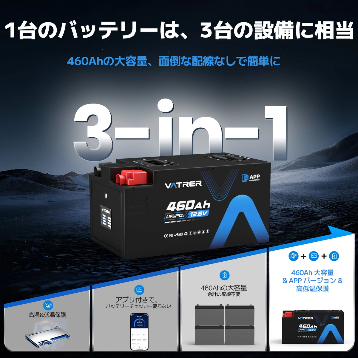 - 【コンパクトなサイズで最大出力】 Vatrer 12V 460Ah LiFePO4 RV バッテリーは、100Ah バッテリー 5 個分のエネルギーに相当しますが、占有スペースはわずか 1.1ft3 で、100Ah バッテリー 5 個よりも小さいです。また、余分な配線やお金を必要とせずに、メンテナンスと設置が簡単になります。お金とスペースの節約に役立ちます。