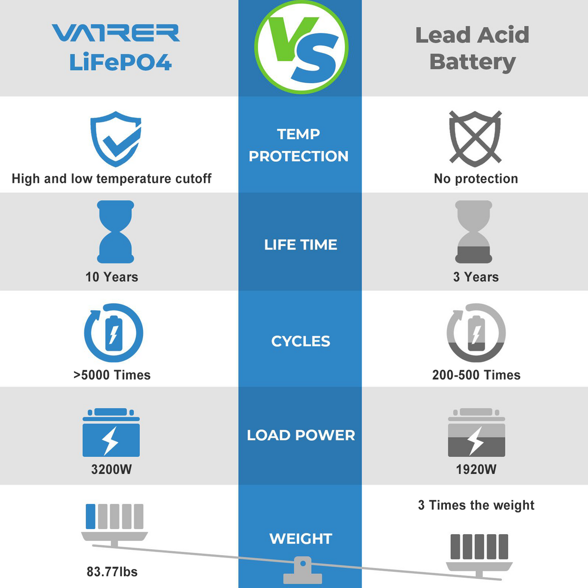• 【Multi-Application & Warranty Service】 With no acid in the lithium-ion battery, you're able to safely mount it in any position. This makes Li-ion batteries perfect for marine, RV, campers, travel trailers, and off-grid applications! Vatrer Power provides warranty service for all batteries. 24hrs friendly and professional customer supports, any question please feel free to contact us.