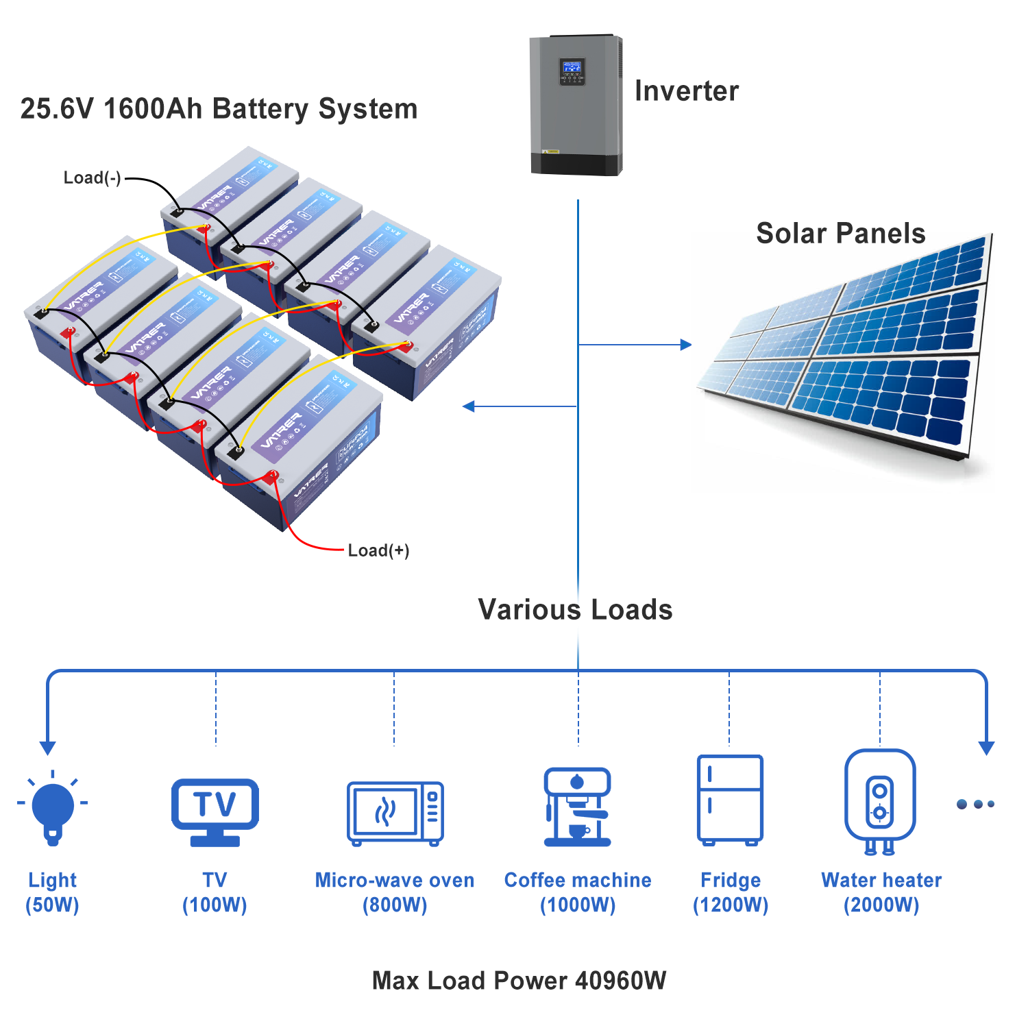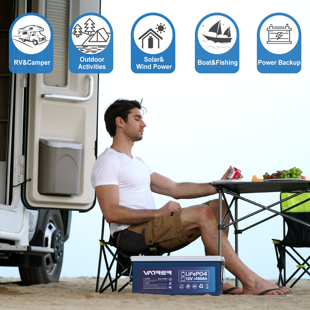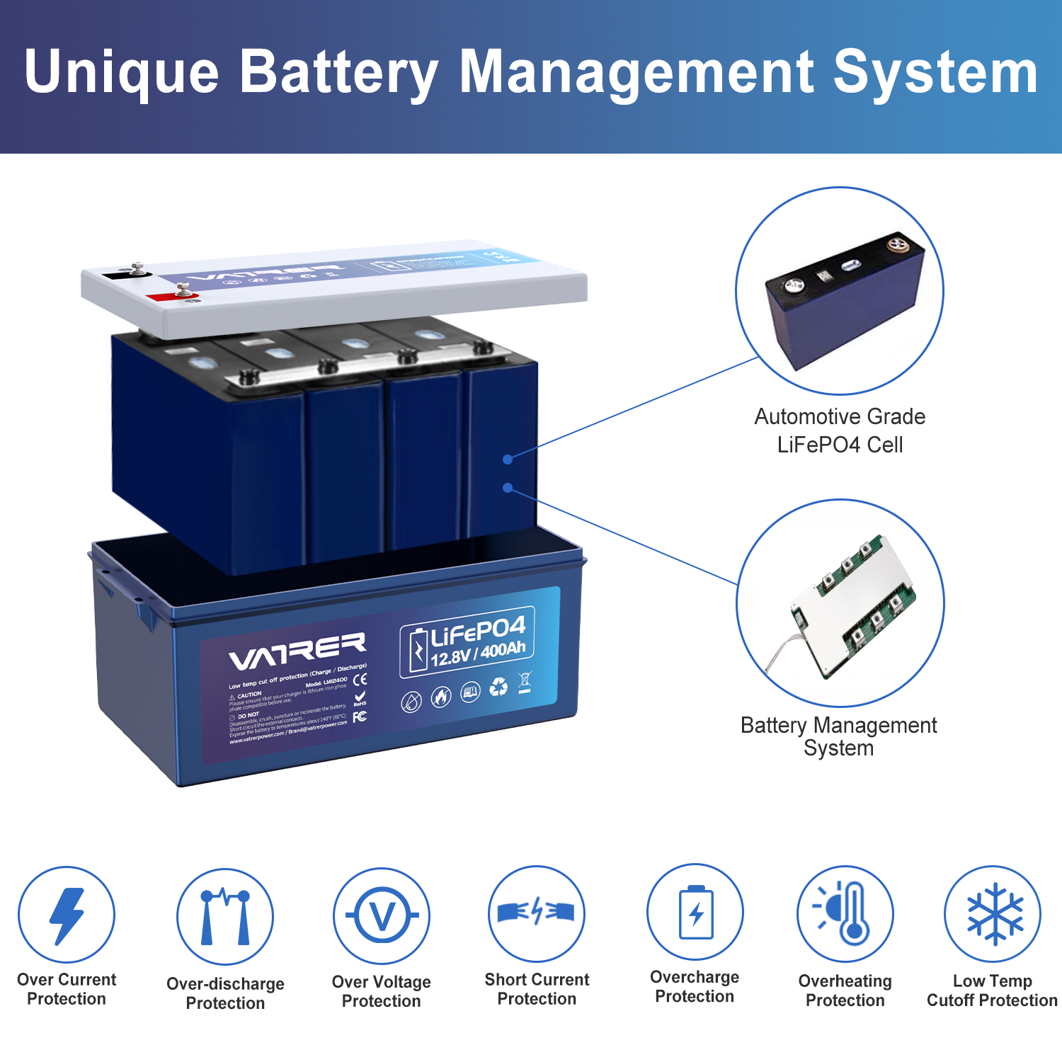 【Compact in Size Max on Power】Vatrer 12V 460Ah LiFePO4 RV battery is equivalent to the energy of 5 x 100Ah batteries but took up only 1.1ft³ of space and is smaller than 5x100ah batteries. And It will be easier to maintain and install without the need for excessive wires and money. Helps you save money and space.