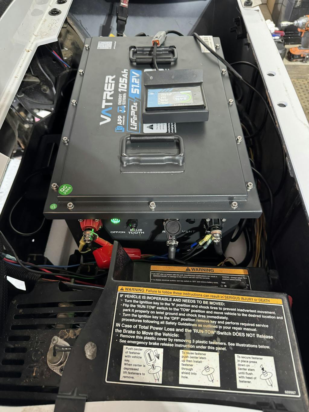 Yes. The Vatrer 48V 105Ah lithium battery features smart monitoring technology that connects to your smartphone via Bluetooth. The companion app displays key data: voltage, temperature, charge percentage, and cycle count in real time. You can also use the integrated 2.8-inch LCD screen for quick on-cart monitoring.