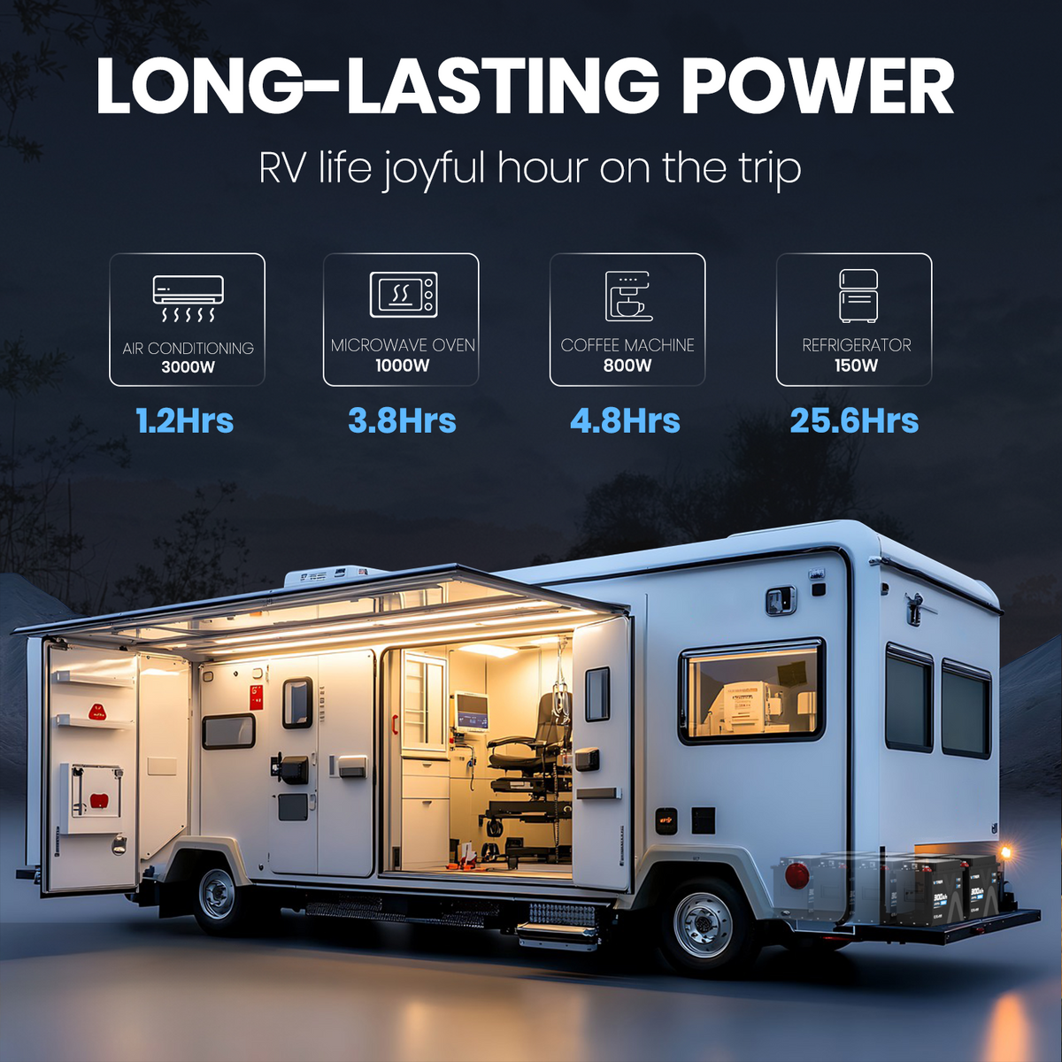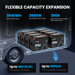- Energy Capacity: Provides 3,840Wh and 3,840W output, supporting 300A continuous discharge and scalable to 38,400Wh with parallel setups.