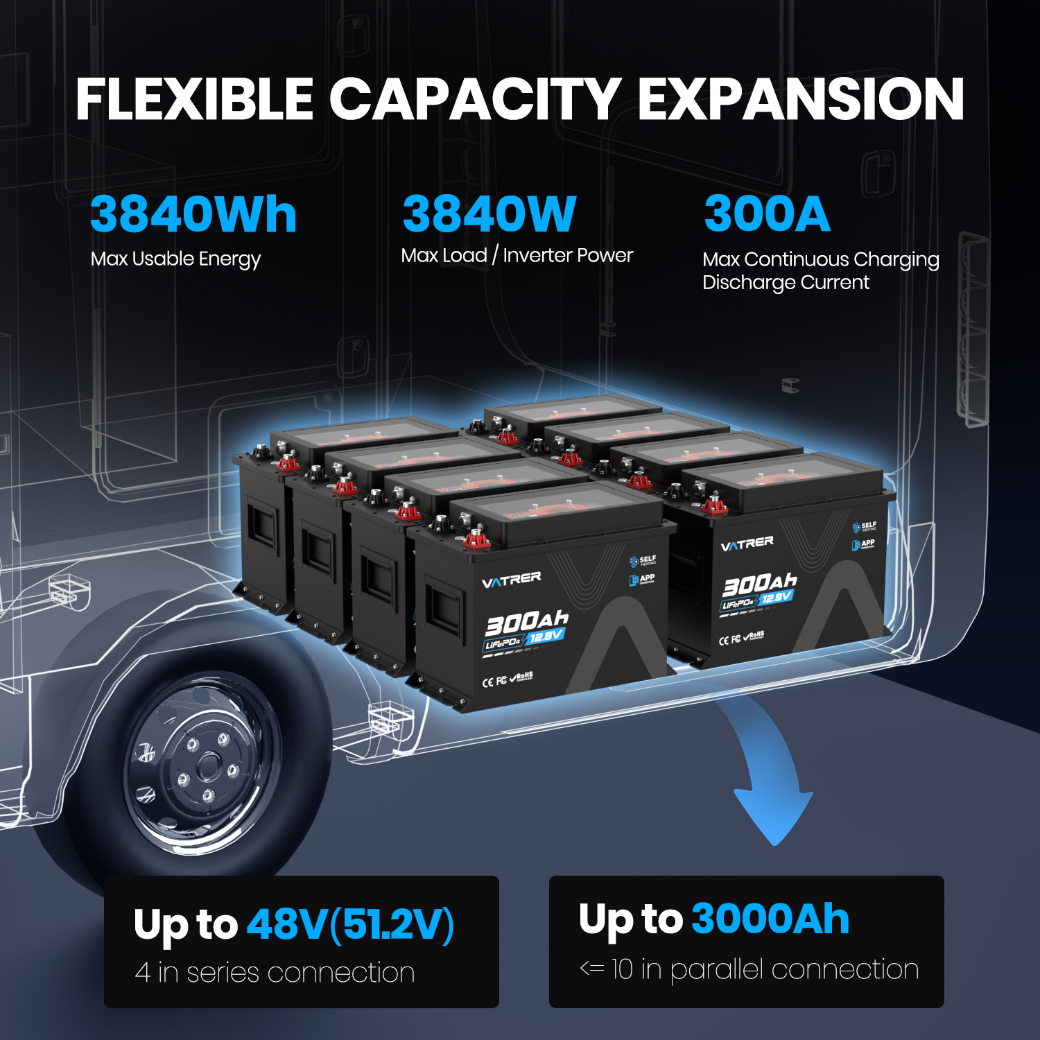 Need more power? The Vatrer 300Ah battery supports expansion with ease. You can link up to 4 units in series to reach 48V (51.2V), ideal for advanced solar or inverter setups, or connect up to 10 in parallel for a massive 3,000Ah capacity, scaling the max usable energy to 38,400Wh. This flexibility ensures you can tailor a reliable power system as your needs grow, whether you have a large RV or a complete home energy solution.