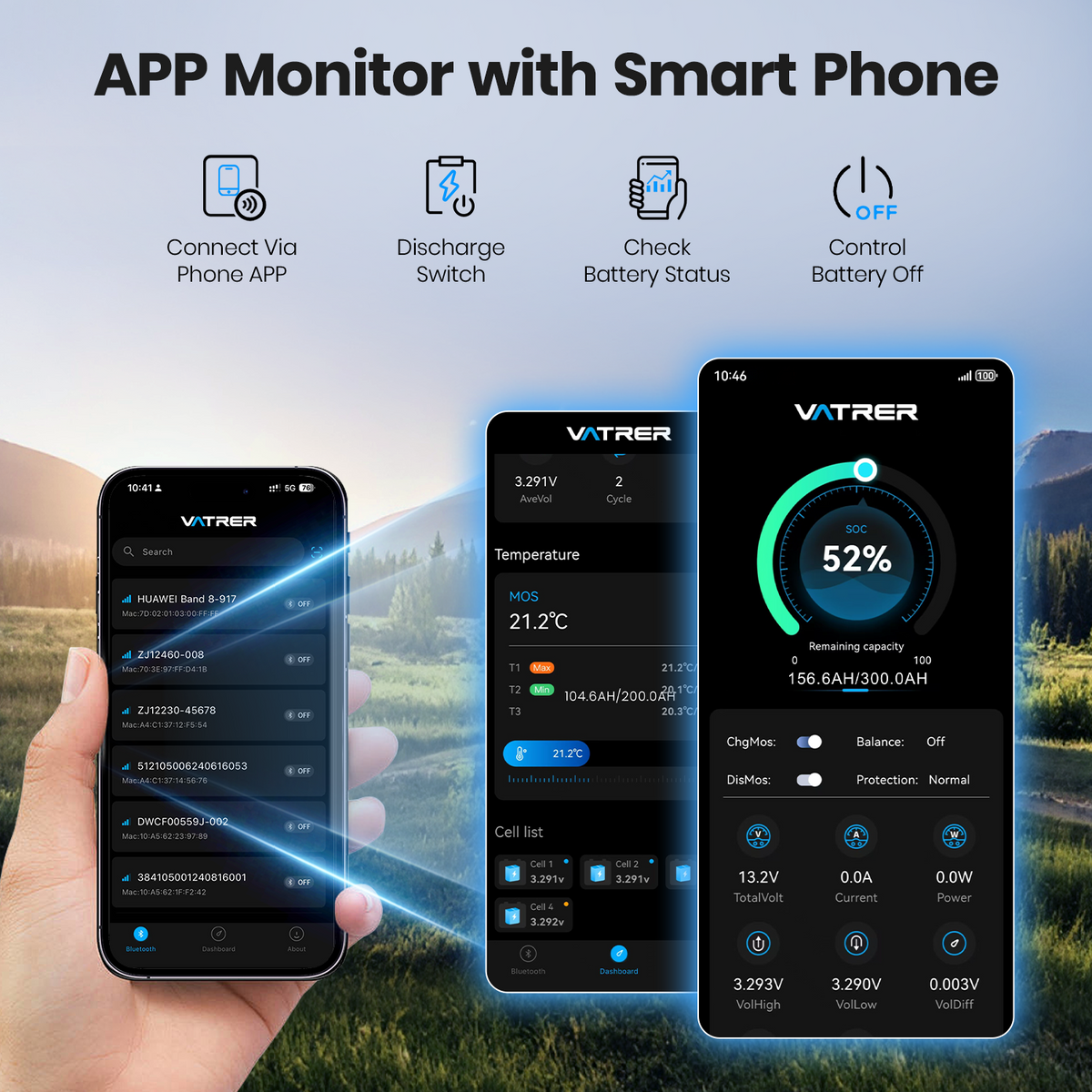 - Bluetooth Monitoring: Tracks real-time metrics, voltage, and temperature via the Vatrer app, offering precise control with a 5.0 connection range up to 33 feet.