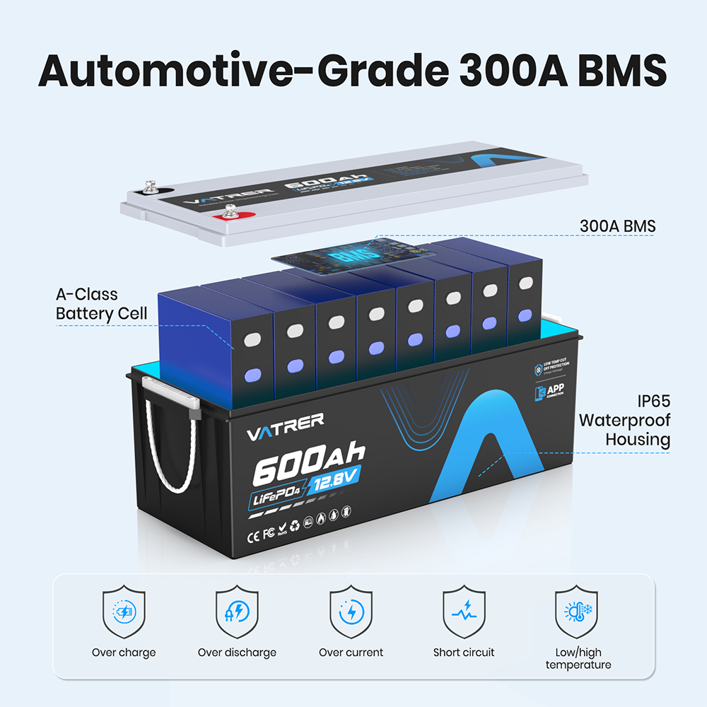 【Superior Safety with Upgraded 300A BMS】 Equipped with an upgraded 300A BMS and Grade A Cells. The battery is safeguarded against overcharging, over-discharging, overcurrent, short-circuiting, low/high temperature, and features auto-cell balance. A built-in 300A BMS protection plate automatically disconnects the battery when the discharge current exceeds 500A 640ms, ensuring security and stability.
