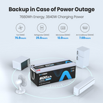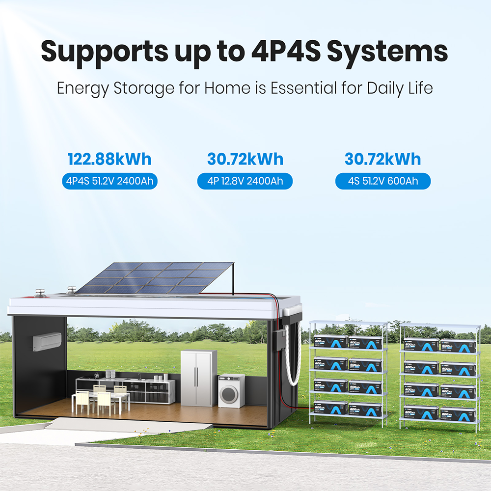 【Expandable Power Capacity】 Expand flexiblely from 7.68kWh to a maximum of 122.88kWh. With 16 identical 12V 600Ah Bluetooth batteries wired in 4P4S, you can easily upgrade your battery system to meet different power needs. Whether for RVs, home backup, or off-grid living, it offers power output from 3.84kW to 61.44kW for various appliances.