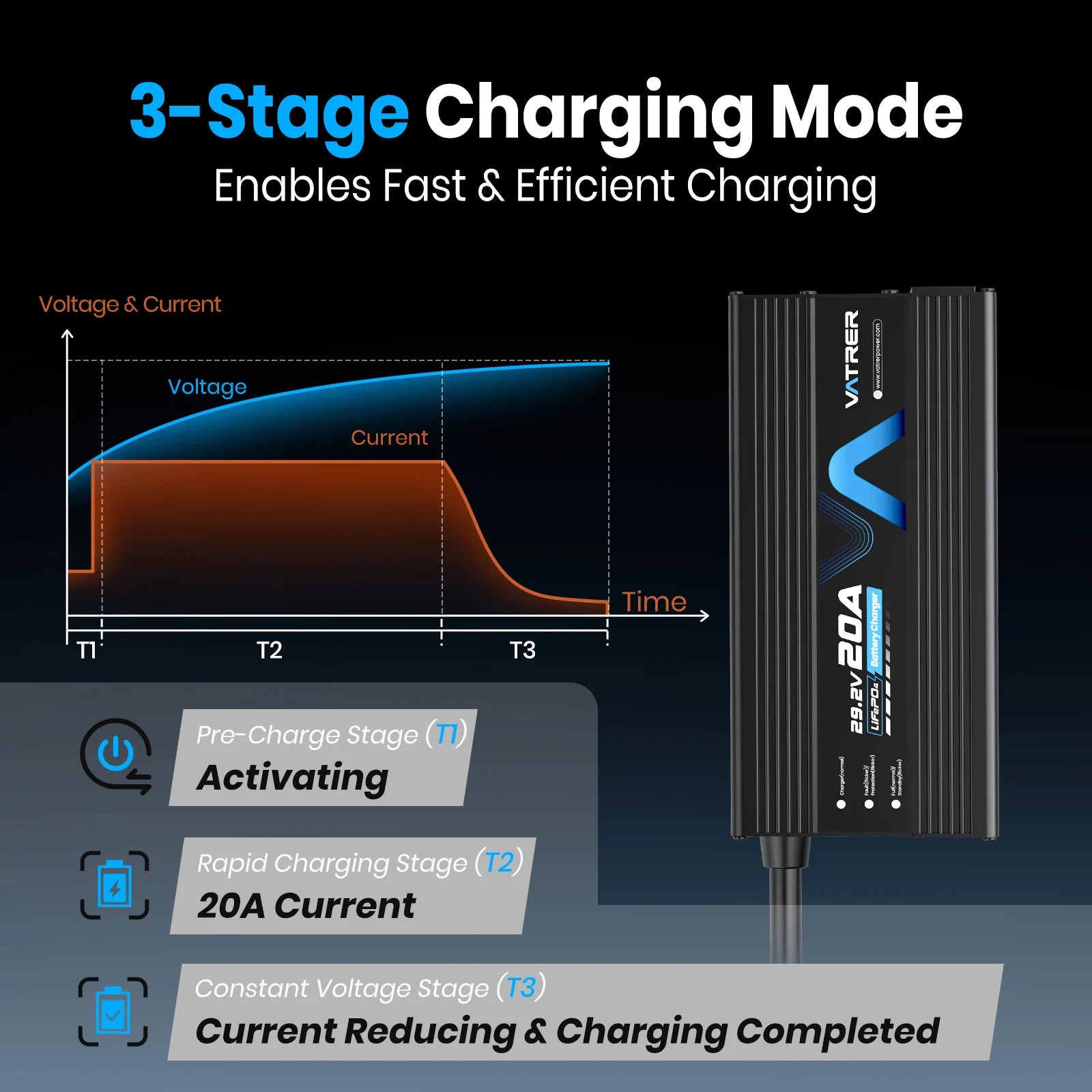 【Intelligent Three-Stage Charging Process】 The 29.2V 20A lithium LiFePO4 battery charger has an intelligent 3-stage charging function. In T1 (pre-charge), when the battery voltage is low, it supplies a small current for activation, repair, and lifespan extension. At the end of T1 or when the voltage is normal, it switches to T2 (fast charge), charging with the utmost bearable constant current. When the voltage hits the set value, it enters T3 (constant voltage charge), where the current gradually decreases. When the current drops to the set value or T3 ends, the charger stops, finishing the charging. This process is scientific, protecting the battery and offering a quality experience.