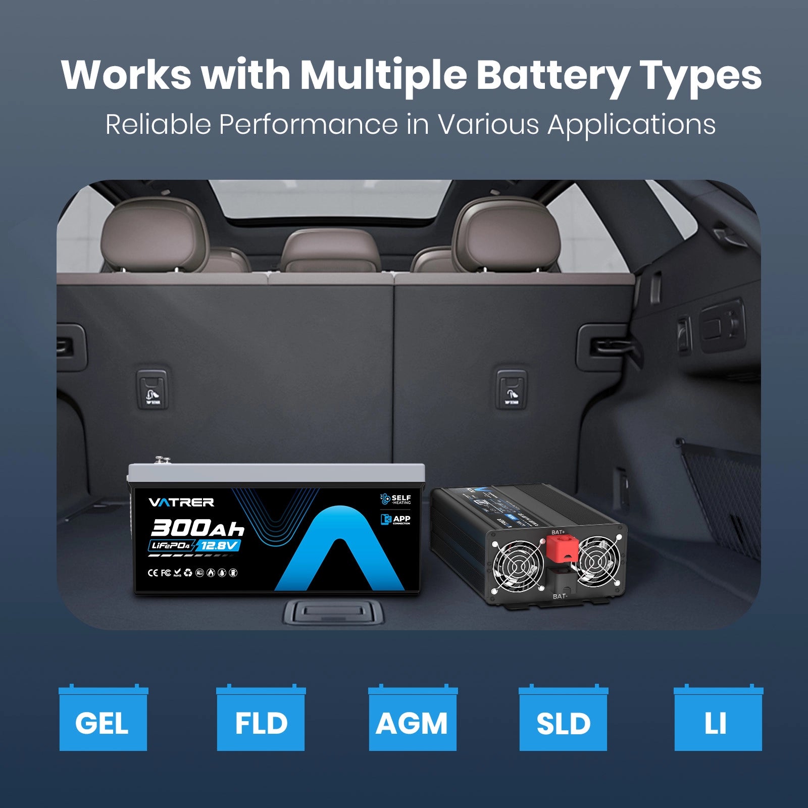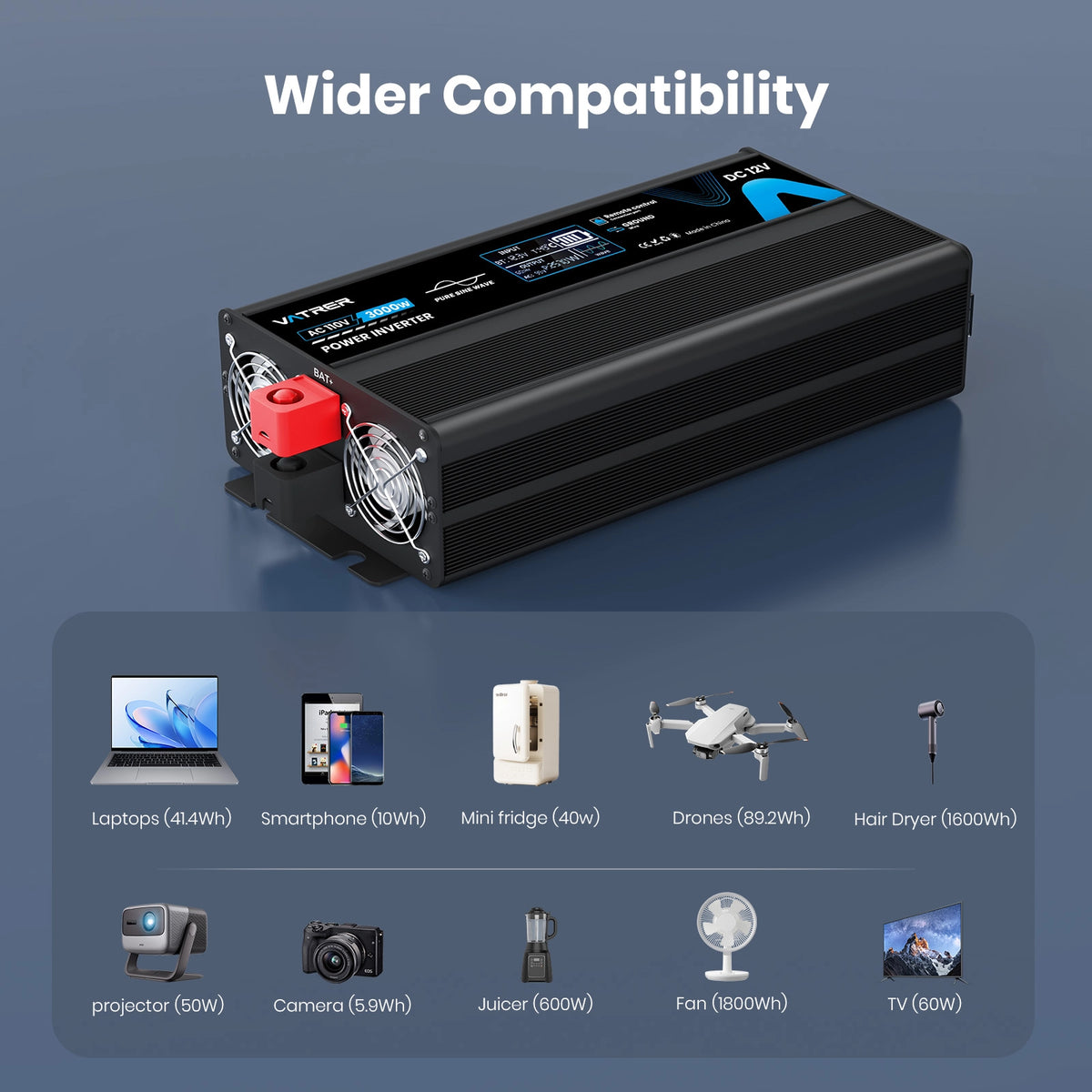 【For 12V 300Ah or Above Batteries 】This pure sine wave inverter is designed for 12V batteries with capacities of 300Ah or larger. It is suitable for lithium batteries, lithium iron phosphate (LiFePO4), lead-acid (gel, AGM), nickel-hydrogen, and other battery packs with a working voltage of 12V.