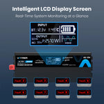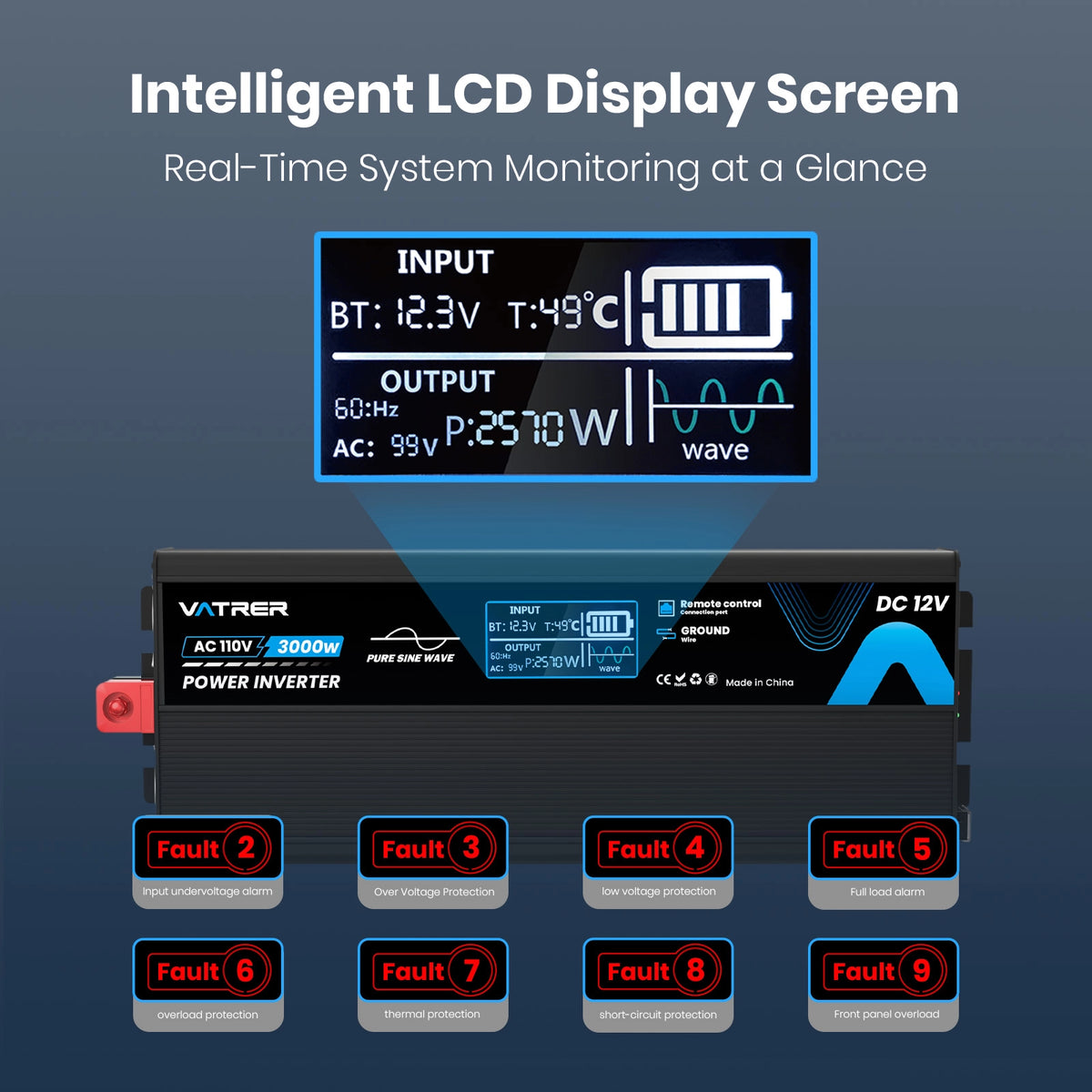 【Intelligent LCD Screen Display】 In the normal working state, the LCD screen displays the input/output voltage, battery status, frequency, and other relevant information. When the inverter is in an abnormal state, the LCD screen will show the specific fault code: Fault 2 (input undervoltage alarm), Fault 3 (over-voltage protection), Fault 4 (low voltage protection), Fault 5 (full load alarm), Fault 6 (overload protection), Fault 7 (thermal protection), Fault 8 (short-circuit protection), and Fault 9 (front board overload). These alerts help users quickly identify and resolve issues.