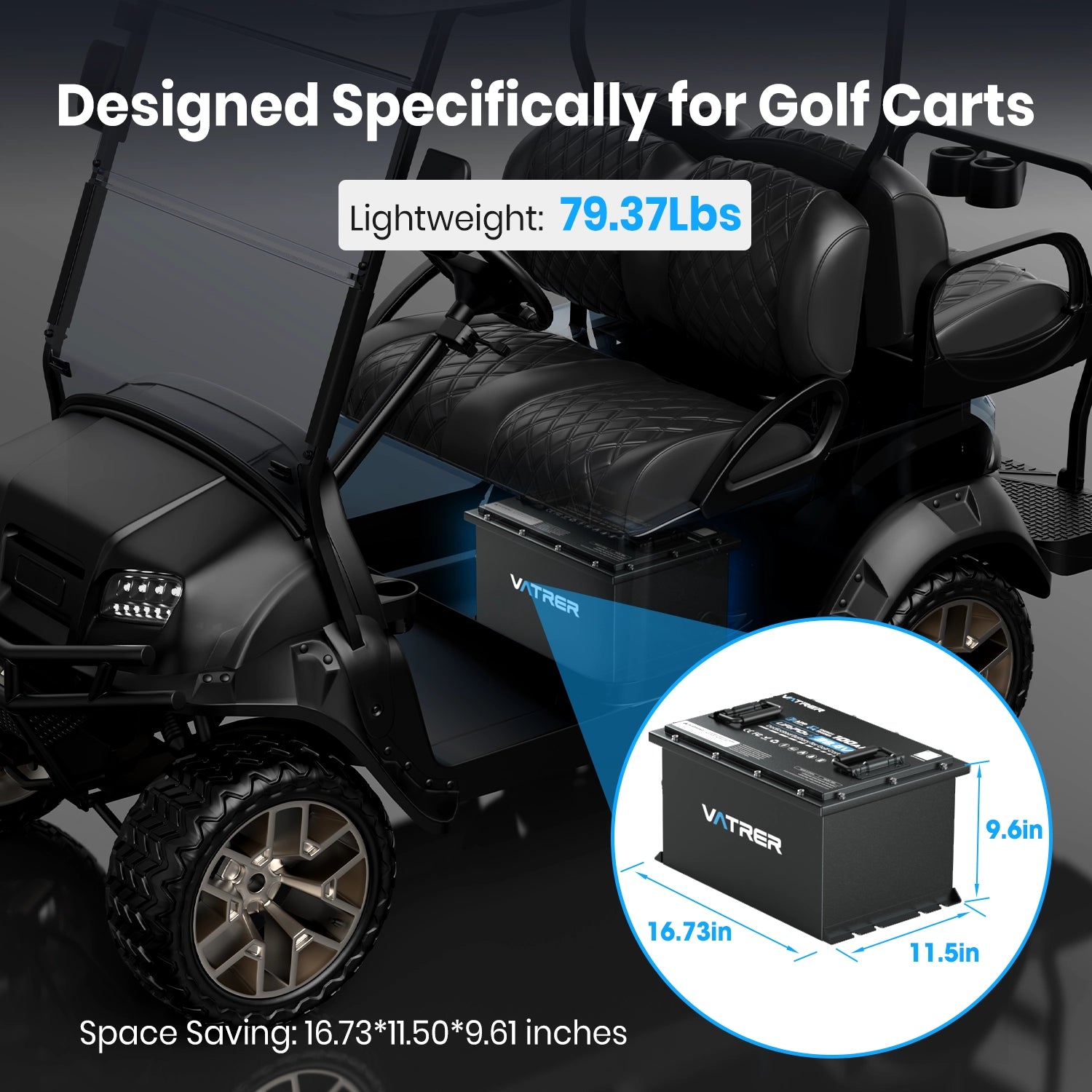 - Lightweight Design: At only 79.37lbs (36kg), this battery is 50% lighter than lead-acid, enhancing cart maneuverability.