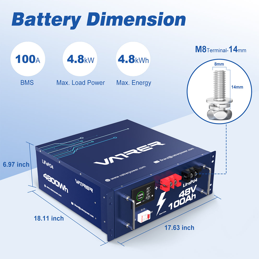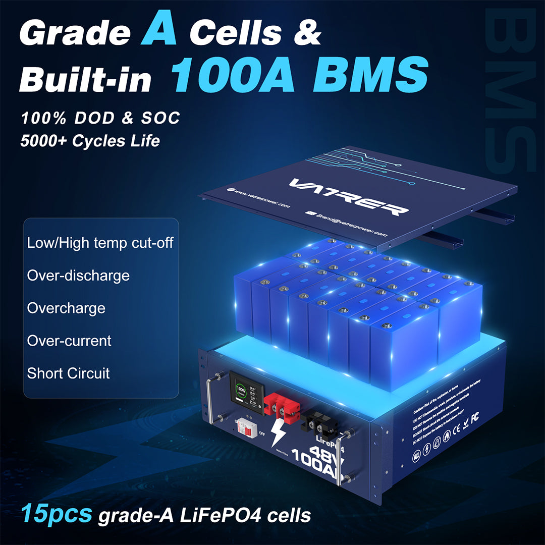 Discover the power and reliability of the Vatrer 48V 100AH LiFePO4 Server Rack Lithium Solar Battery, equipped with Grade A cells and a built-in 100A BMS (Battery Management System). This battery is designed to exceed your expectations, delivering exceptional performance and durability for your solar energy storage needs.