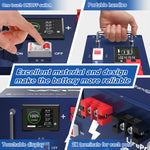 【One-touch Switch & Double Terminals】 48V 100Ah LiFePO4 battery supports a one-touch ON/OFF switch for easy operation, it can be turned on or off with one touch. This button also acts as a circuit breaker, it will automatically shut down to protect the 48V battery when the load current is too high. The lithium battery has two positive terminals and two negative terminals, which help to equalize the current, reduce heat, and avoid overheating caused by the accumulation of all on one terminal.
