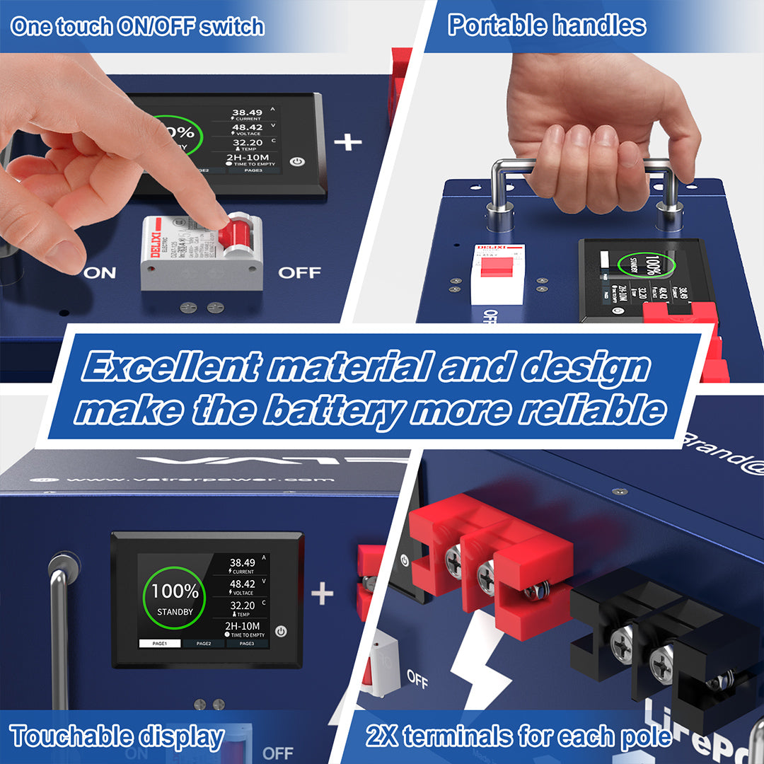 【Smart Touch Screen 】Vatrer Power 48V 100Ah Lithium battery has a more user-friendly design with a touchable smart display that enables you to monitor & control the battery at any time and anywhere. This is undoubtedly a huge innovation that brings great convenience to the user experience.