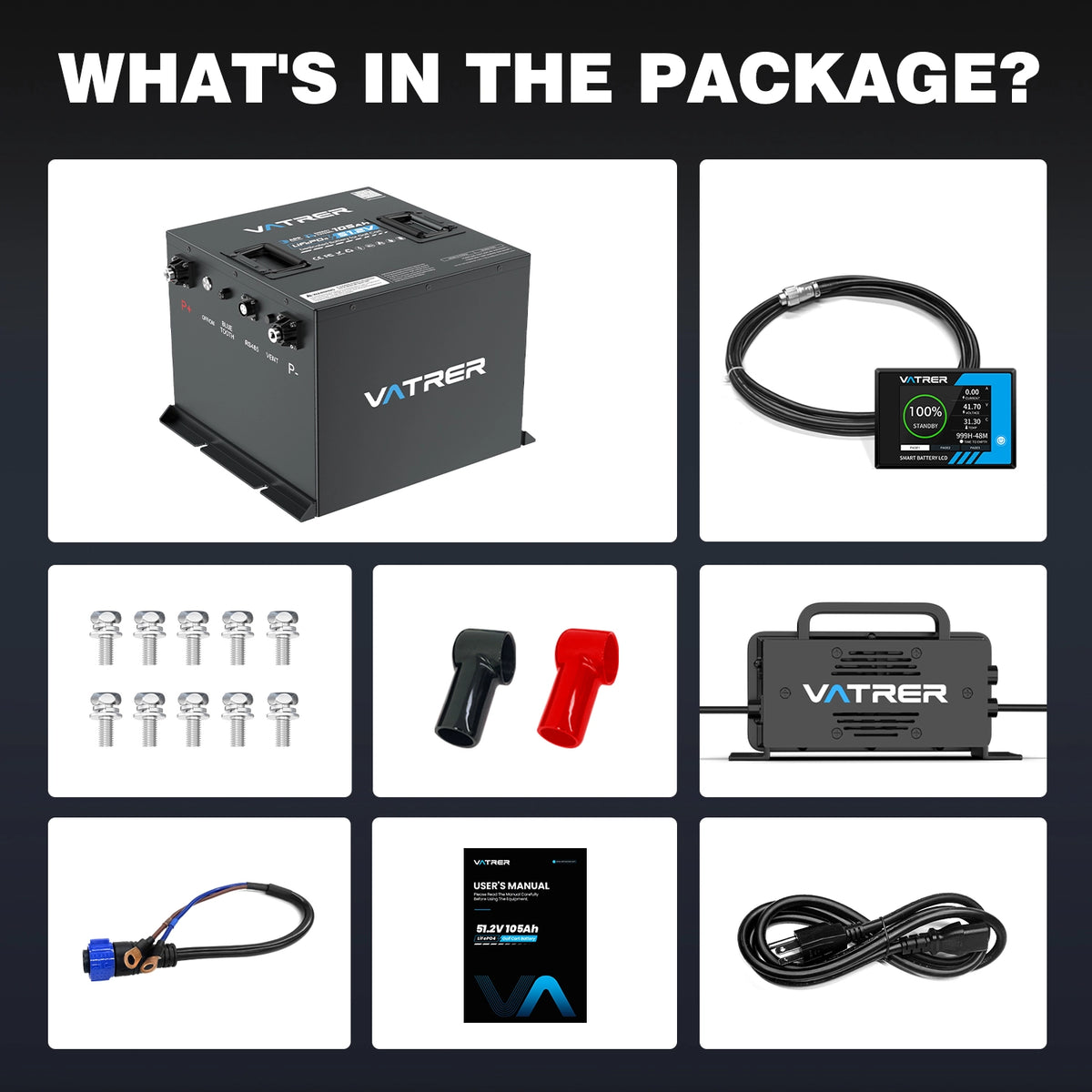 Accessories 1x51.2V 105Ah Golf Cart Battery, 1x 58.4V 20A LiFePO4 Charger, 1x2.8in LCD Screen, Communication Cables