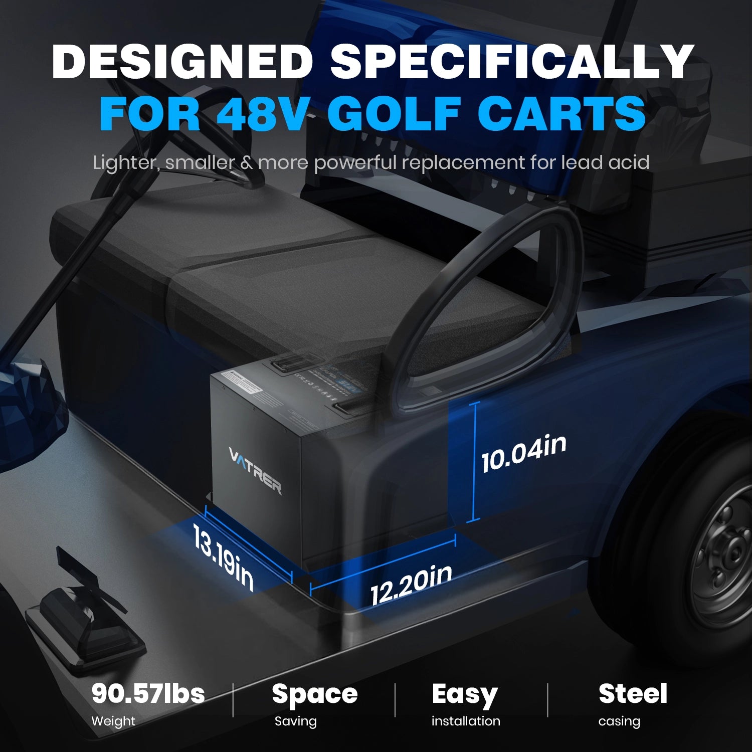 Looking for a reliable upgrade for your 48V golf cart? This Vatrer power 48V 105Ah mini battery measures 13.19 x 12.2 x 10.04 inches and weighs just 90.57 lbs, fitting easily into tight spaces compared to double-sized alternatives. It provides 5,376kWh of usable energy and 10,24kw power enough to power your 48V golf cart for extended use and is built with high-quality lifepo4 cells and a durable SPCC steel casing design.