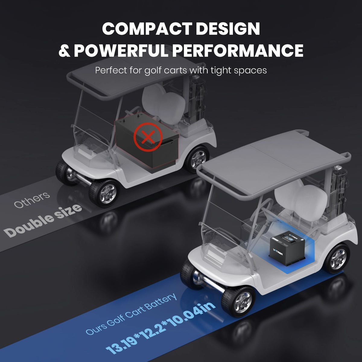 • Compact Powerhouse: Vatrer 48V 105Ah Mini Lithium Golf Cart Battery measures 13.19 x 12.2 x 10.04 inches, fitting tight spaces while delivering 5,376kWh of usable energy.