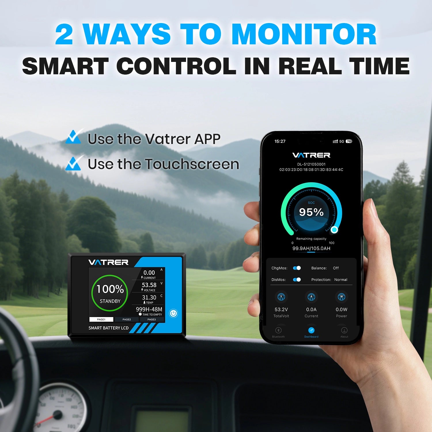 The 2.8-inch touch screen displays real-time data like state of charge (SOC), voltage, current, and power. The Vatrer app adds detailed monitoring, like 95% SOC and 53.7V 0.4A, helping you plan your next round with accurate power levels, offering two convenient control methods.